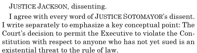 Justice Jackson joined Justice Sotomayor and added this fierce sentence: "I agree with every word of Justice Sotomayor's dissent. I write separately to emphasize a key conceptual point: The Court’s decision to permit the Executive to violate the Constitution with respect to anyone who has not yet sued is an existential threat to the rule of law."