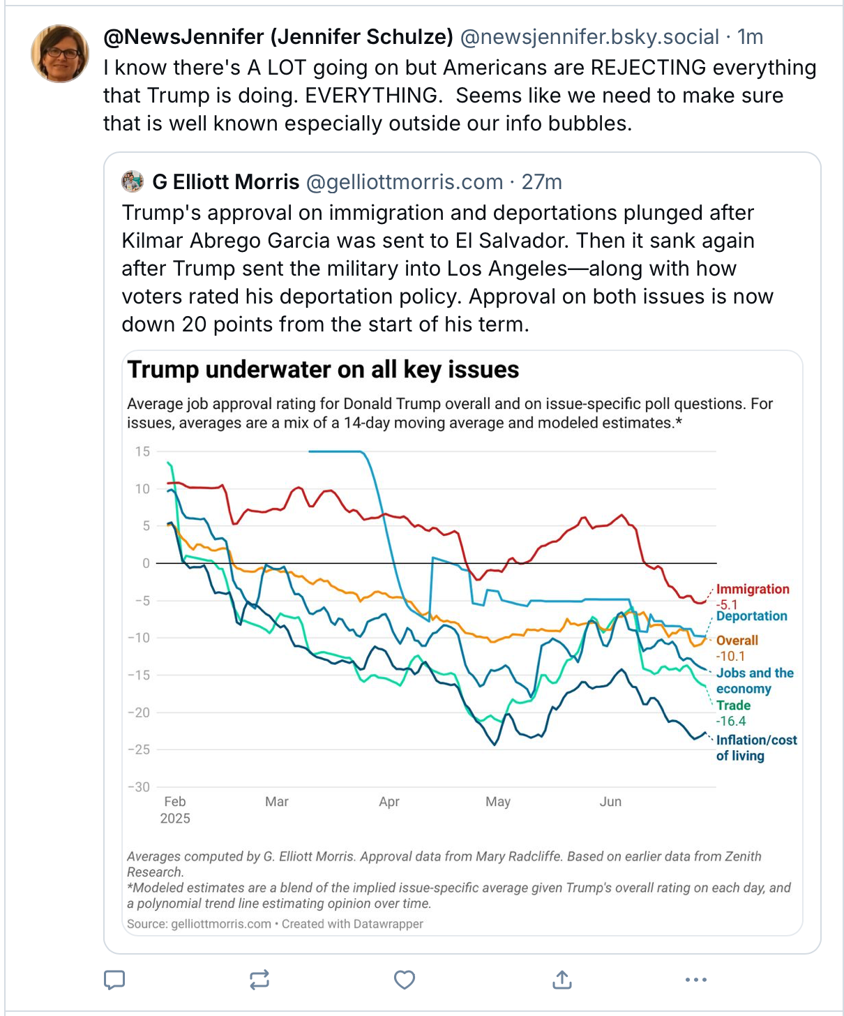 But I was heartened by the sheer size, distribution across all states and presence in many small communities, and the energy of the No Kings demonstrations earlier this month. And by the strong solidarity with immigrants and refugees that's been evident in many ways, along with the polls showing that the Trump regime and its measures, including the current attacks on immigrants are deeply unpopular (something obvious but maybe worth saying again is authoritarians have to be authoritarian because what they're doing is unpopular; the will of the people has to be suppressed for them to impose their agenda, and the Trump Administration is becoming increasingly unpopular with the public).