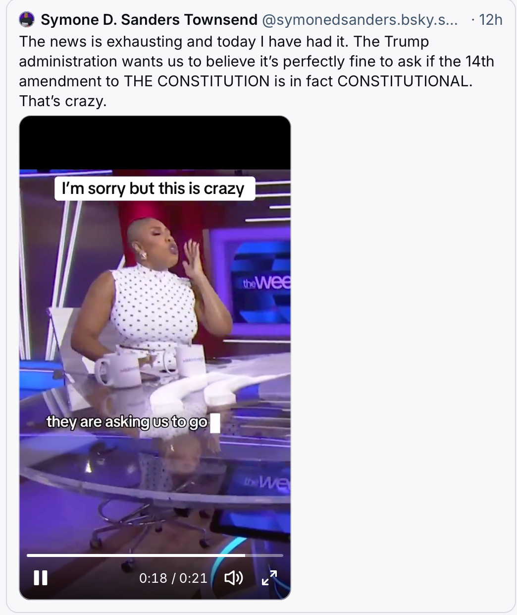 The first section of the Fourteenth Amendment reads, "All persons born or naturalized in the United States, and subject to the jurisdiction thereof, are citizens of the United States and of the State wherein they reside. No State shall make or enforce any law which shall abridge the privileges or immunities of citizens of the United States; nor shall any State deprive any person of life, liberty, or property, without due process of law; nor deny to any person within its jurisdiction the equal protection of the laws." That seems pretty incontrovertible, but it's inconvenient to the Trump pogroms, so now it's been controverted.