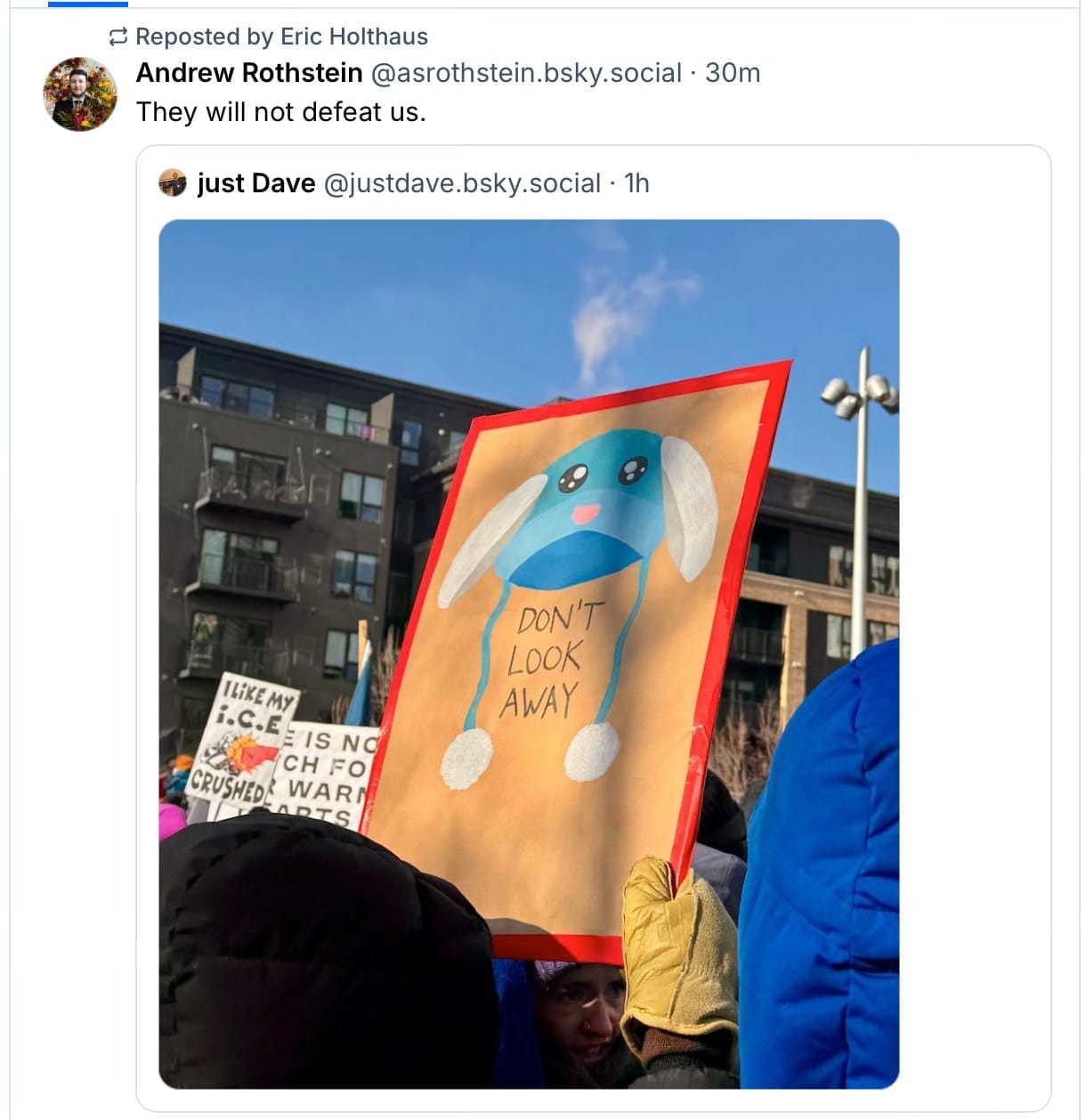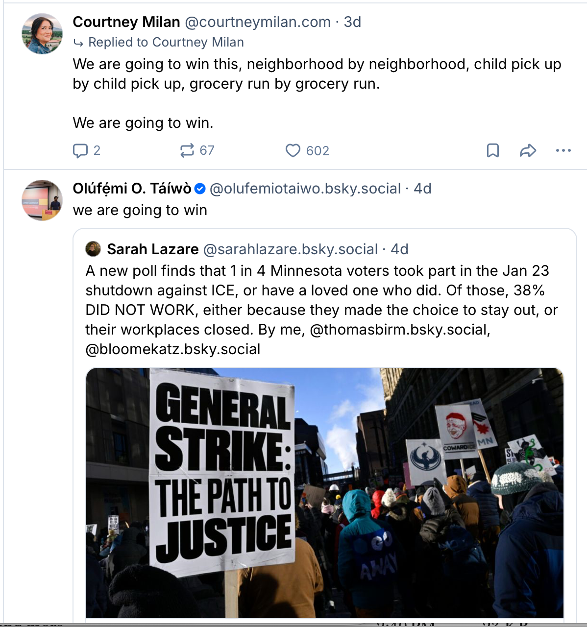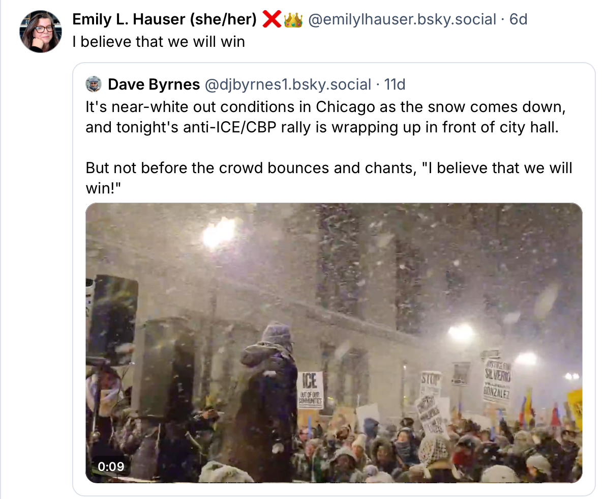 One of the observers in Minneapolis – those people who follow and document ICE there, at considerable risk – told journalist Jon Collins at MPR News, “I think they’re getting angry that we’re winning and the country is rallying around us. We’re so organized and we act with such integrity. They don’t want to admit they feel threatened by us.” Journalist Jon Collins concludes, "It's more soccer moms than hardcore activists, they said. But the challenging conditions have brought them closer together. After knowing each other for just weeks, they feel like they’d give their lives to protect one another if necessary." The woman Collins quoted told him she says to her family: “If I am killed doing this, throw my body at the White House, martyr the shit out of me and raise hell. Do not be sad. Do not think I would do anything differently. I would do it over and over again — this is too important to sit down and shut up and not do anything.” When people feel like that, they are very hard to defeat, and the momentum is on their side. Her daughter understands, she says, because she is learning about Martin Luther King, Jr., in school.
