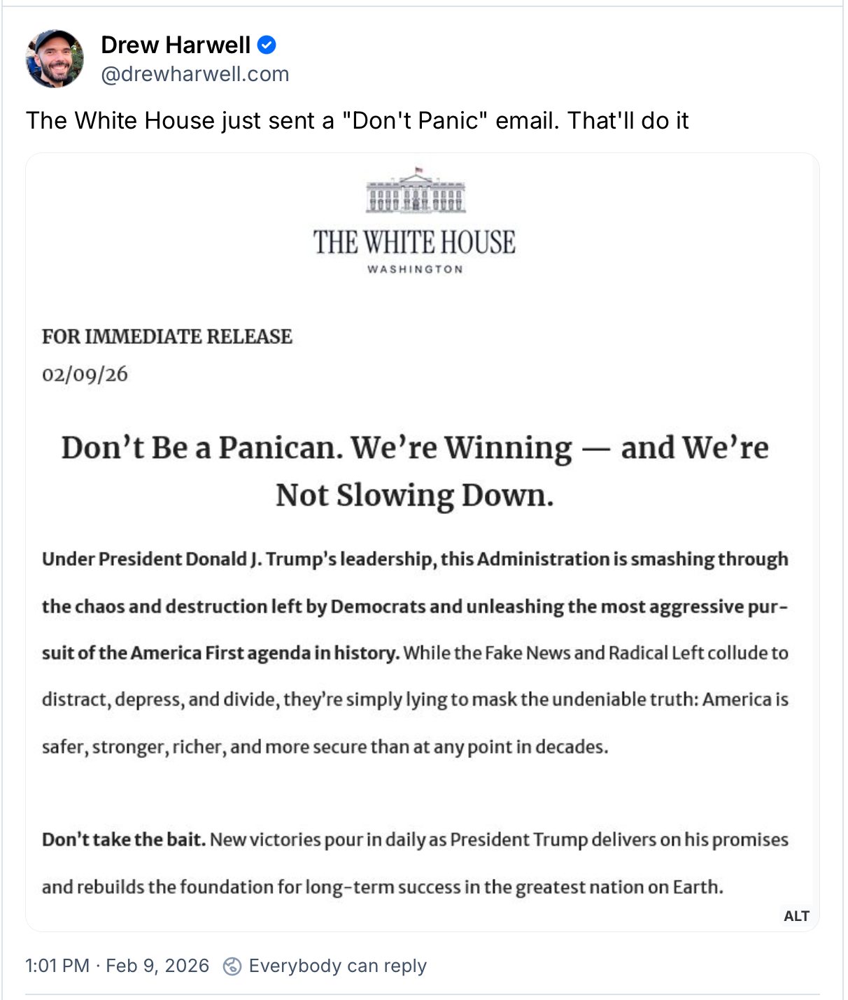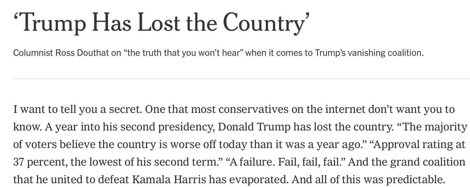 He writes: I want to tell you a secret. One that most conservatives on the internet don’t want you to know. A year into his second presidency, Donald Trump has lost the country. “The majority of voters believe the country is worse off today than it was a year ago.” “Approval rating at 37 percent, the lowest of his second term.” “A failure. Fail, fail, fail.” And the grand coalition that he united to defeat Kamala Harris has evaporated. And all of this was predictable. From the first days of DOGE through the debacle in Minneapolis, the Trump administration has consistently governed as if swing voters aren’t part of its coalition. And now, guess what? They’re not. ... There’s no one to point out the bleeding obvious: that the Trump administration is failing because it is making many millions of normal Americans feel totally freaked out. “I regret voting for Donald Trump.” “So I work on my family’s farm, and we’ve lost our best hands because of Trump’s deportations.” And the conservatives who are willing to say that are the kind of people who are easy for parts of the right to dismiss. New York Times conservatives. Trump skeptics rather than true believers. But damn it, I’m right. I was right when I warned liberals in the Biden era that they were losing the country and enabling Donald Trump’s return. And I’m right when I tell conservatives and populists the truth that they don’t hear enough of on right-wing media: that unless the administration finds a way to seem a little bit more moderate and just a little bit more normal, there isn’t going to be any Trump legacy at all.