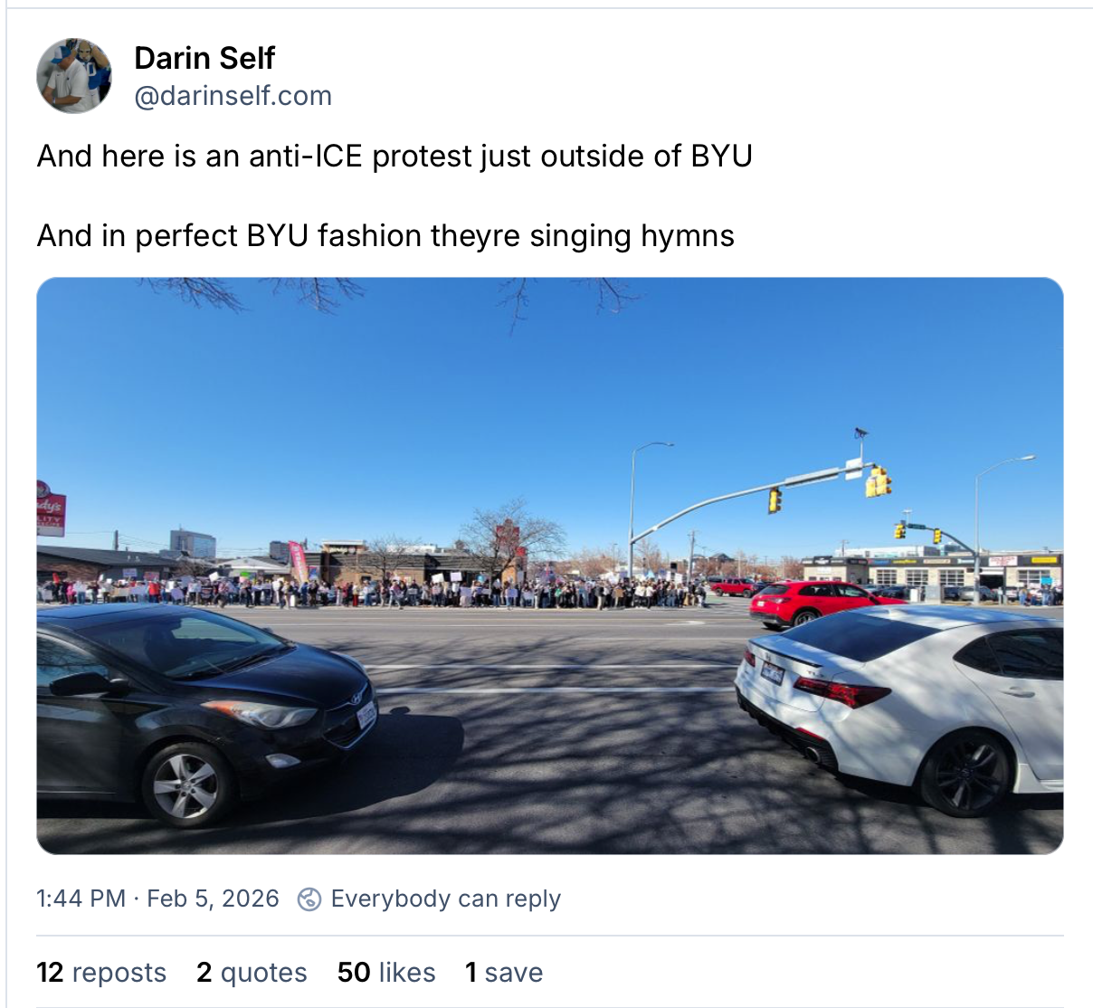 Look! Just below: a Brigham Young University anti-ICE protest. And don't you love all those high school students all over the country walking out of class in protest of ICE? The Louisville, Kentucky, Courier Journal reports, "Hundreds of students across Louisville walked out of class Feb. 6 to protest the actions of Immigration and Customs Enforcement agents that have sparked nationwide demonstrations.At duPont Manual High School, students held signs that read “ICE kills” and chanted “ICE out.”."