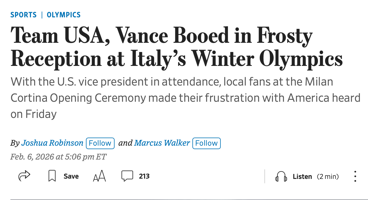 Meanwhile, Vance has had a Year of Boos. They boo'd him in Vermont almost a year ago when he tried to ski there, they boo'd him in Greenland, they boo'd him here, they boo'd him there, they boo him, boo him everywhere. They boo'd him big at the Olympics in Italy last Friday where he tried to glom onto the glory of the country's top athletes, poor things. Vance is supernaturally unlikeable and he does a lot to maximize that quality with his sneers, hate speech, and lies. It's said that Trump skipped the Super Bowl because he couldn't face the booing. And the Super Bowl was barely the Super Bowl; it was the most widely watched halftime show in history, in which a beautiful repudiation of Trump values was enacted with verve and generosity, and most of us barely noticed there was also a sports event.