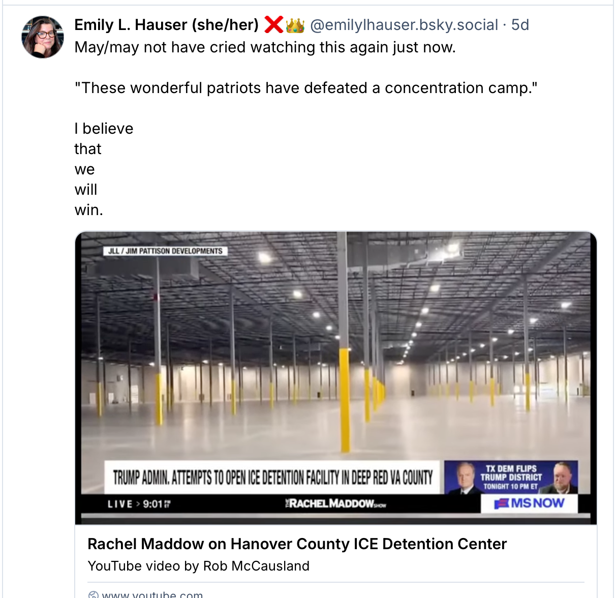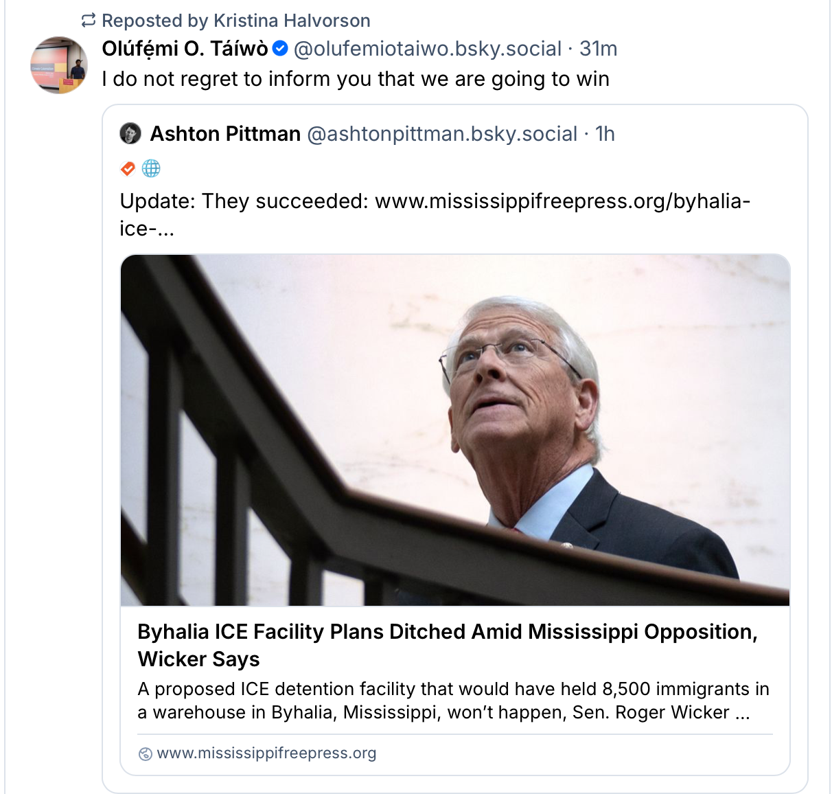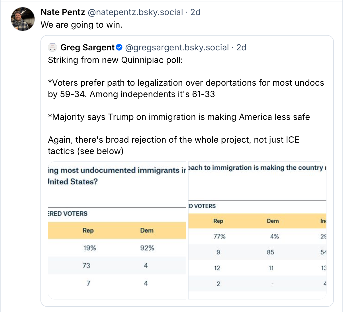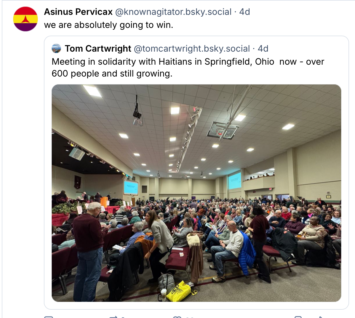 Also we have God on our side, and I say that without sarcasm. That amazing show of clergy in Minneapolis late last month. The way the Catholic church is coming out strong for immigrants. Episcopalians! Methodists! United Church of Christ! All the progressive Protestant denominations, along with rabbis, imams, and those Catholics (who seem to demonstrate that Pope Francis was quietly rebuilding the leadership in his own image, appointment by appointment). In Springfield, Ohio, the Guardian reports, churches are at the heart of community response against the Trump Administration threats against Haitian residents, and across the country churches are becoming meeting places, training grounds, and organizing networks for immigrant solidarity work.