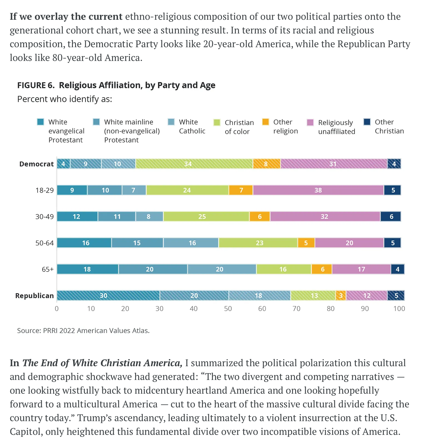 Given a group approximately half of whom like Ray Charles better and half of whom prefer Aretha Franklin, does it work to say that this group likes Charles better? The white women category was useless in this respect, because it didn't contain a meaningful majority, but two opposing camps. However, you could readily find subcategories in which the great majority did vote one way or another in that election and subsequent ones. White evangelical Christians are hardcore Trump voters but then people make sweeping generalizations about evangelical Christians and even about Christians. Black evangelical Christians have very different politics. Fun side note, white evangelical Christians are a rapidly shrinking population; scholar Robert P. Jones notes, "The continued demographic decline makes it clear the MAGA goal of reestablishing their vision of a white Christian America can’t be realized by democratic means" and includes this chart.
