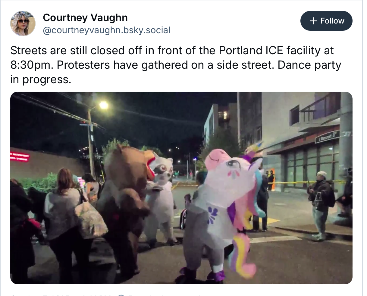 I've been loving the people in Portland protesting ICE from inside big inflatable costumes of cute creatures, because that undermines the attempt to portray the anti-ICE left as terrorists while mocking how ICE dresses up as wartime commandos to brutalize civilians. The young man inside the inflatable chicken told local publication Willamette Week how the costumes disrupt the categories: "There’s been a nice overall whimsy that has shown up. The frog is amazing. We had a bunch of other inflatable people here last night, too. I saw people playing Twister the other day. What they rely on is fear. So by coming out in an absurdist manner, it speaks to them, to some extent, that we’re actually not that afraid. It also dismantles their narrative a little bit. When they try to describe this situation as 'war-torn,' it becomes much harder to take them seriously when they have to post a video saying [U.S. Secretary of Homeland Security] Kristi Noem is up on the balcony staring over the Antifa Army and it’s, like, eight journalists and five protesters and one of them is in a chicken suit."
