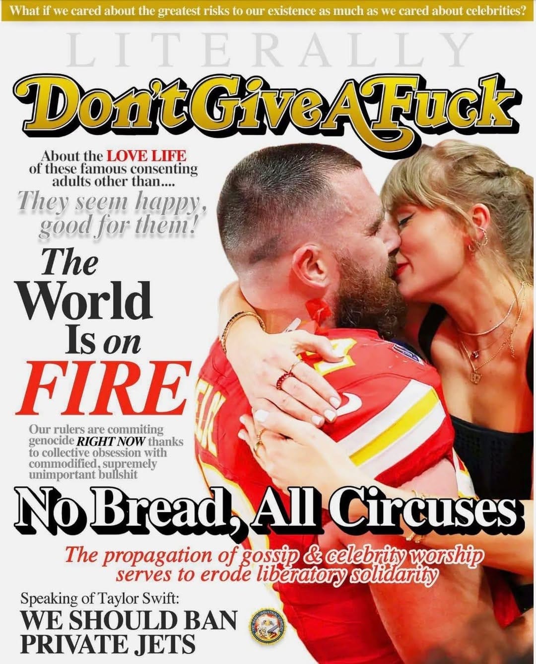 Someone made this extra-grumpy meme about the fact that football player and podcaster Travis Kelce proposed to pop superstar Taylor Swift and now they're engaged, or rather about the fact that of course lots of people and media outlets are paying lots of attention, which Grumpy Meme believes is an incorrect use of our time. As some smart people pointed out to me, someone spent a lot of time making this admonition not to spend our time thinking about what the maker clearly spent time thinking about. Bread and circuses – to be clear, I have never actually watched a football game, and while I like Swift's lyrical gifts, I haven't listened to her much. But about that bread-and-circuses part of the meme: