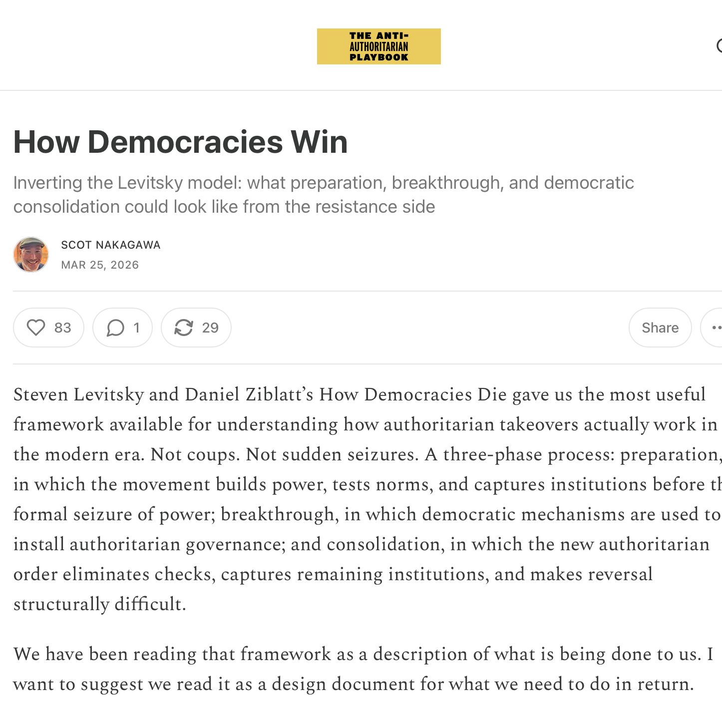 But also what's wrong with feeling good? "Joy doesn't betray but sustains activism. And when you face a politics that aspires to make you fearful, alienated and isolated, joy is a fine initial act of insurrection," I wrote a while back. Timothy Snyder posted, "I was at a #NoKings rally yesterday and rather than writing another essay about why this matters I will just say that it is pure joy to meet the people who want to stand out and the people who are doing the work. Thank you."