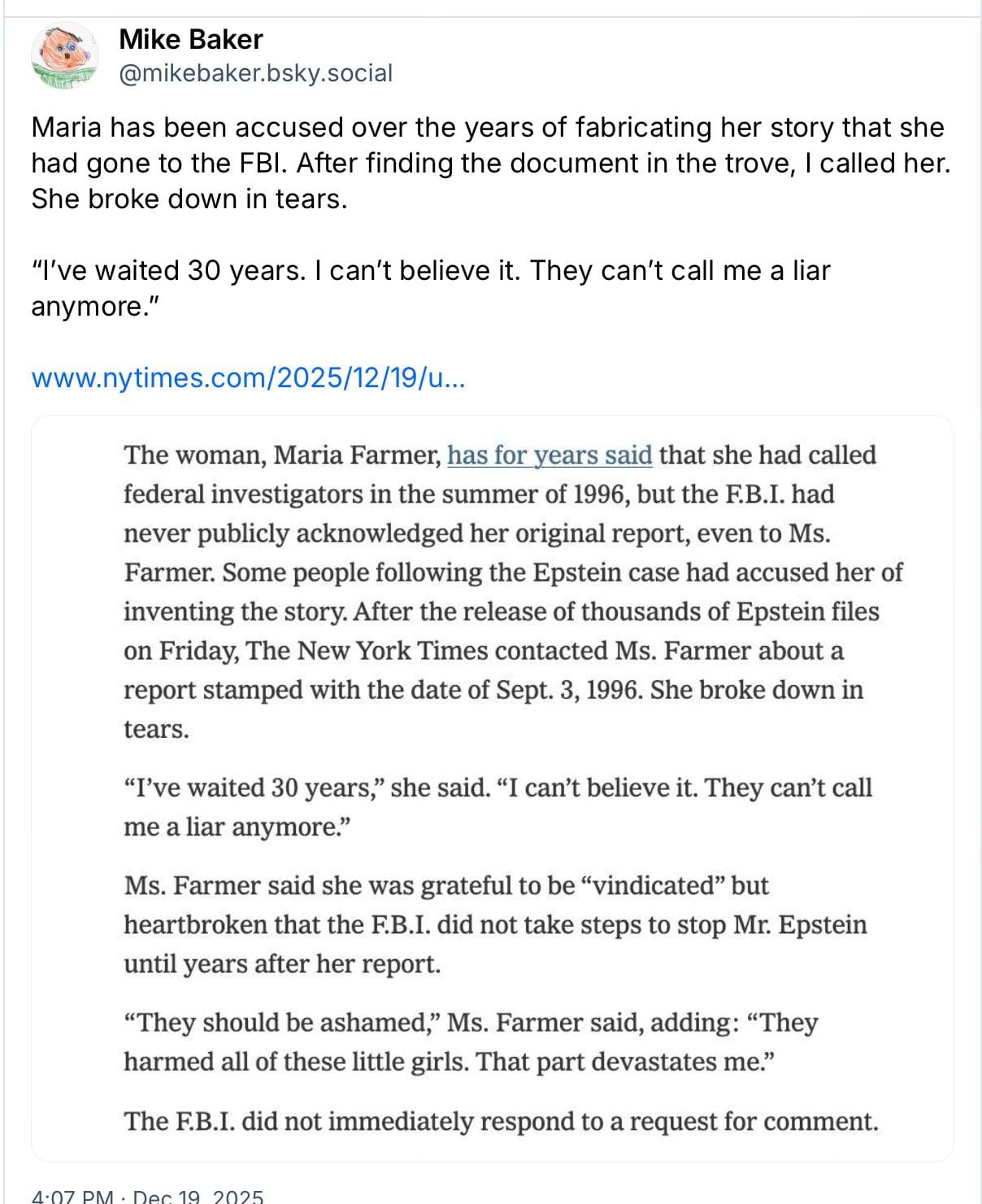 In one stunning story whose capstone came yesterday, the files released yesterday included confirmation that Maria Farmer, a young artist lured into Epstein's world by a pretense to support her art that turned into sexual assault by Epstein and Maxwell, had indeed gone to the FBI in 1996 to report Epstein. There was no follow-up by the department. Had there been, Epstein's next twenty-plus years of rape, terrorization, and trafficking might never have happened. But the FBI chose not to take seriously the charges by a young woman about a wealthy, powerful man, even though she was a firsthand witness and a victim. And then that young woman, like so many others, so many countless others, was treated as a liar, a person unqualified to bear witness, a person who should not be listened to. She wasn't. The child rape and other crimes continued. Mike Baker, in the screenshot below, talks about her reaction when he told her he'd just found the document that confirms her account. She wept.