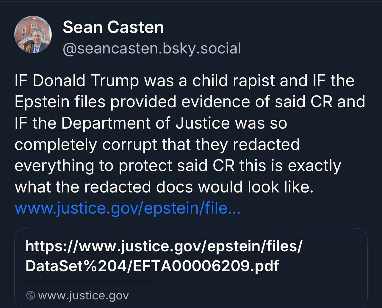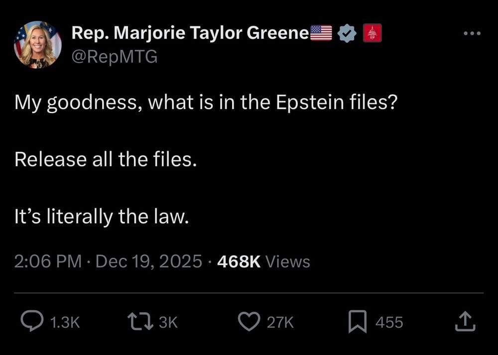 But it's also clear that there is likely something in the files that further incriminates him. This is why a thousand FBI agents frantically scoured the files earlier this year to find mentions of him (an outrage that has not received nearly enough attention), why he had public meltdowns this summer about the issue, why Pam Bondi and the Department of Justice, which had already been reorganized to protect him rather than us, to twist the law to that end rather than uphold the law, had to be forced by an act of Congress to release the files. And why they have failed to obey in full.