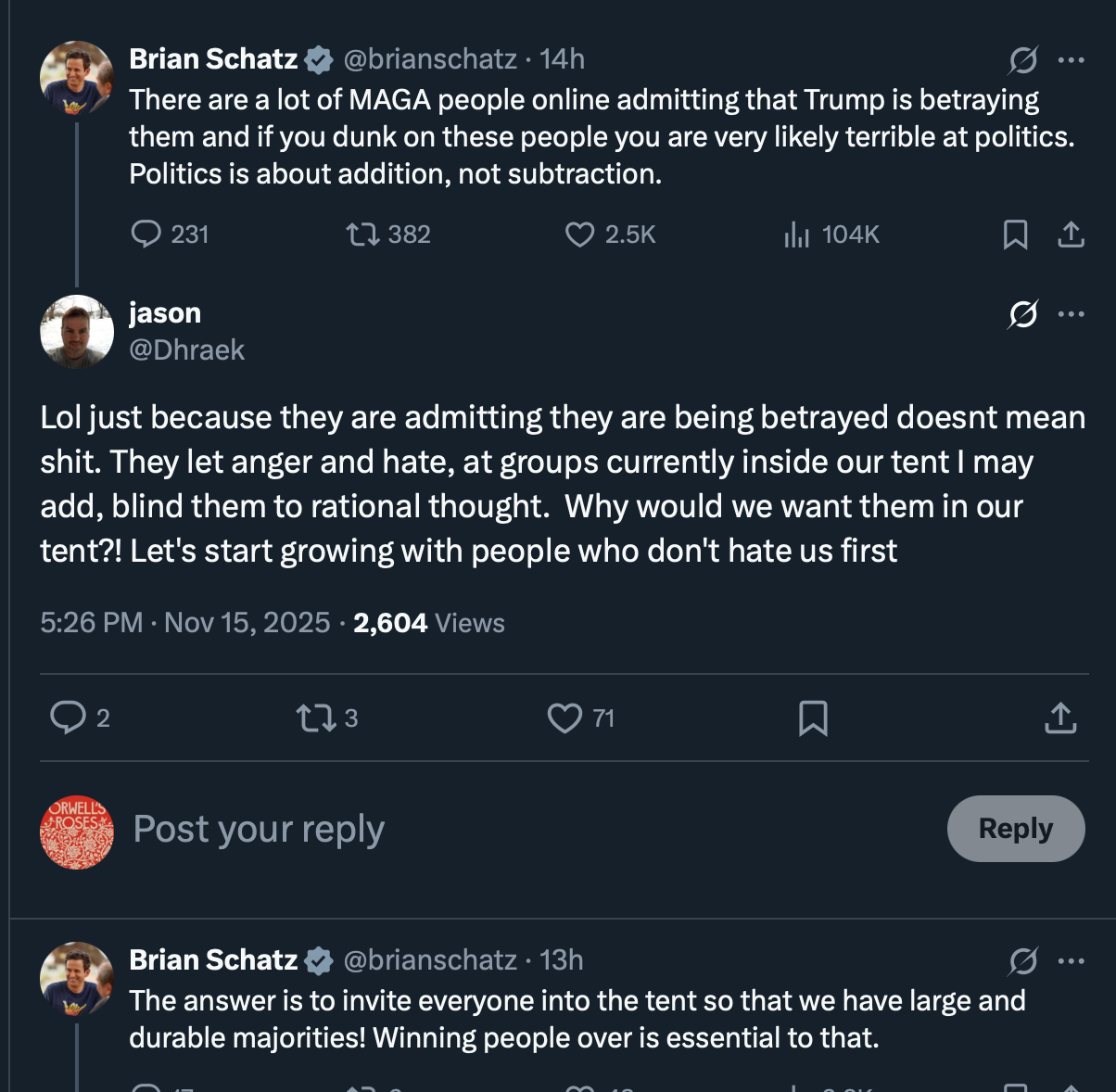 It's striking to me that a lot of people want politics to be about their personal feelings, in which case they're not engaged in politics, though they may be engaged in the sabotage of politics. This is why I declared that "voting is a chess move, not a valentine," all those years ago, meaning you vote strategically. You work with the available options. You win by growing your coalition for elections, whether it's the election to put someone in office or the kind of votes that happen once anyone from a school board member to a senator is in office. This off-the-cuff essay was prompted by Senator Brian Schatz tweeting this comment, and the responses were dismaying; the one in this screenshot is a typical example.