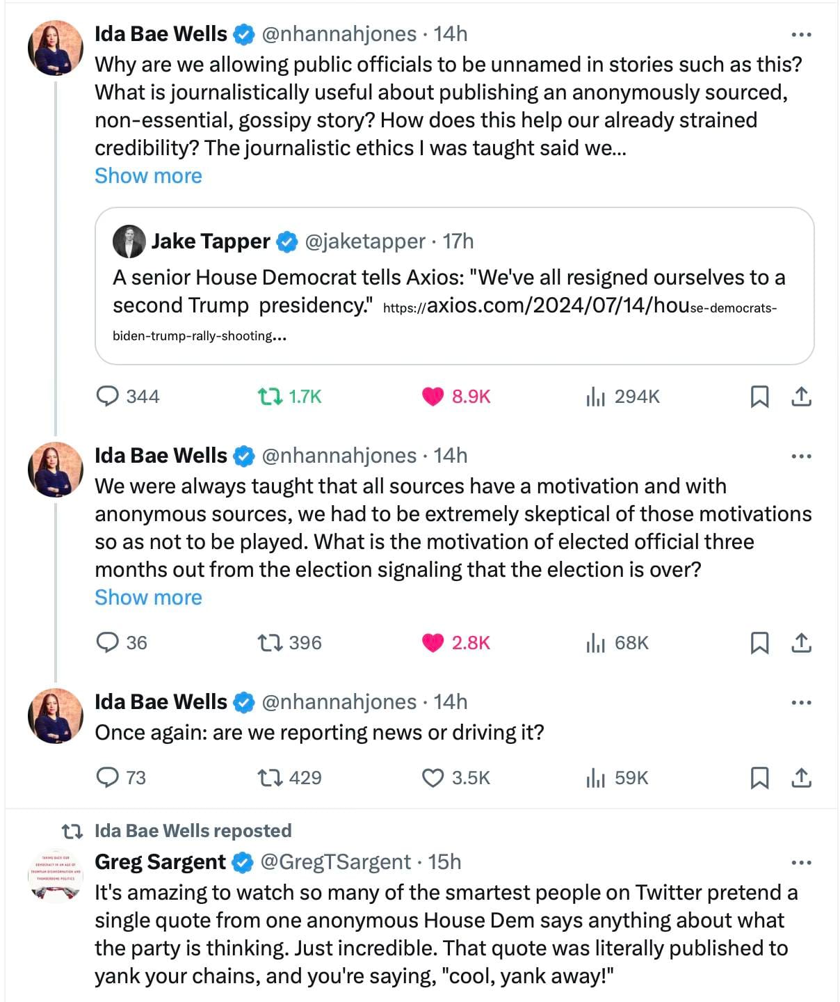 The book also seems to be an example of the anonymous sources which bad journalism leans on heavily to further its agenda. You can pretty much find someone to say whatever you want, if they don't have to go on the record, and you can claim that someone is representative of something – the American people, say – but they're more likely to be representative of the journalist's agenda. Here in the screenshot below is Tapper last summer glomming onto an Axios anonymous source saying Democrats are resigned to defeat. (Tapper, incidentally, moderated the June debate in which Biden did so badly, as did Trump, but there are no standards to which Trump is held by the mainstream media.)