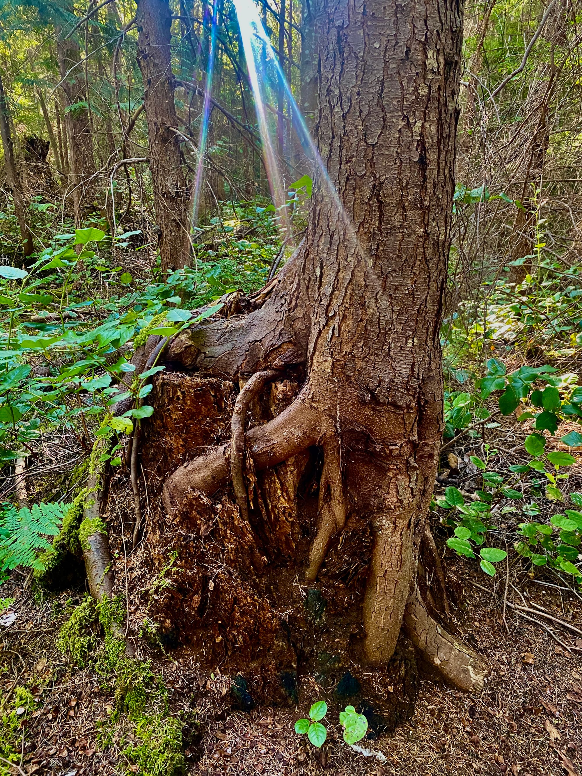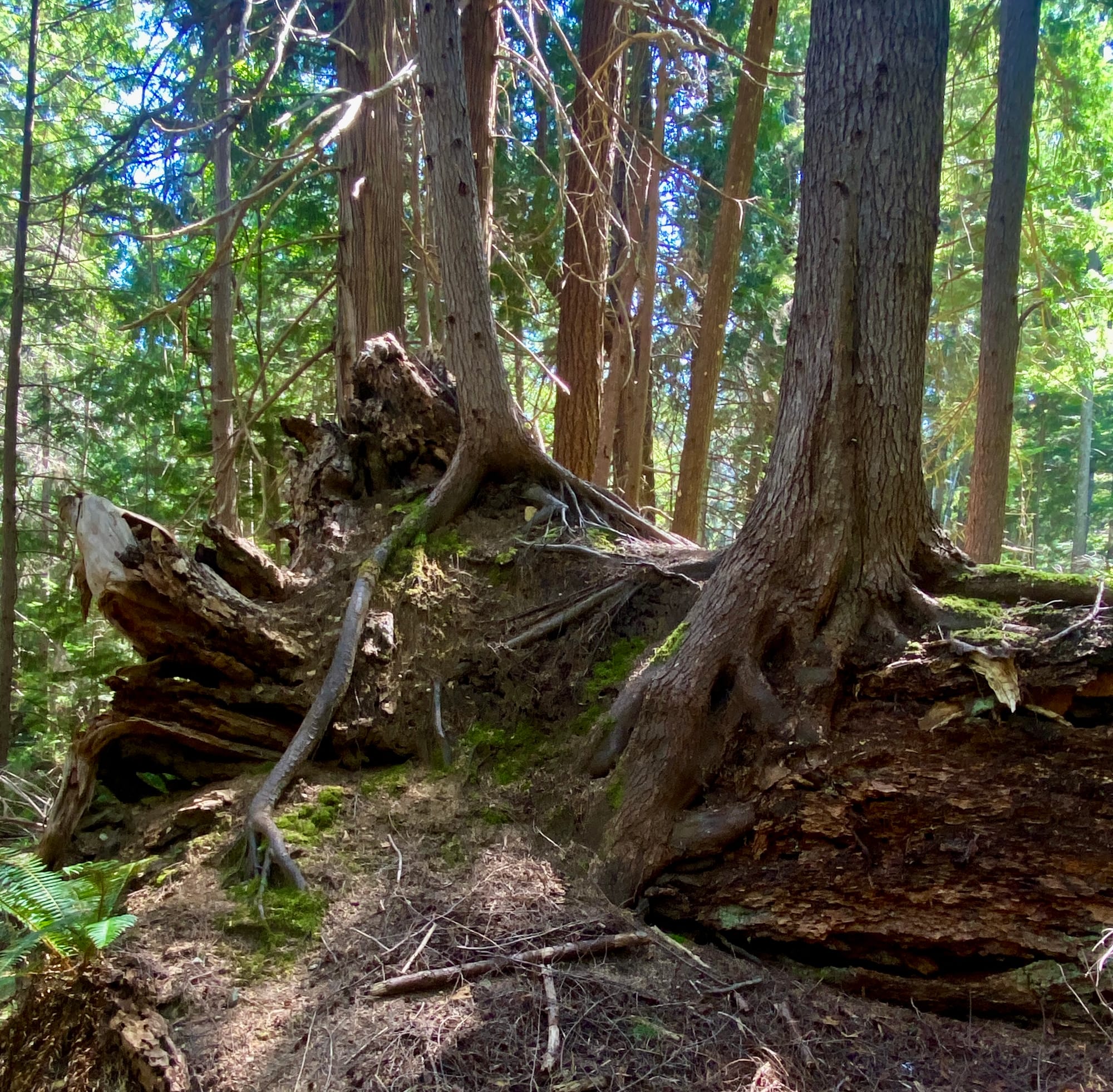 I write while staying in one of the great forests of British Columbia, a forest in which the inextricability of life from death is gorgeously evident. Several kinds of fern spring from this soil, some taller than me, birds move among the branches, many kinds of berries abound. It is lavish, almost hectic with life, and with the inextricability of life and death. Magnificent fallen trees turn back into soil as younger trees reach downward to twine around their ancestors' trunks and upward toward the sky. The roots growing around and gripping these decaying logs look like veins and tentacles and fingers clutching and reaching toward an anchor in the soil. Some of the mature cedars and conifers stand on mounds that must be fully decayed trees or rather once were trees and are further along in the process of becoming soil. Often a great tree that's fallen over still has at its base a tall shield that is its roots still clinging to rounded stones and soil, and from this the trunk stretches across the earth. These trees from which trees grow are known as nurse logs.