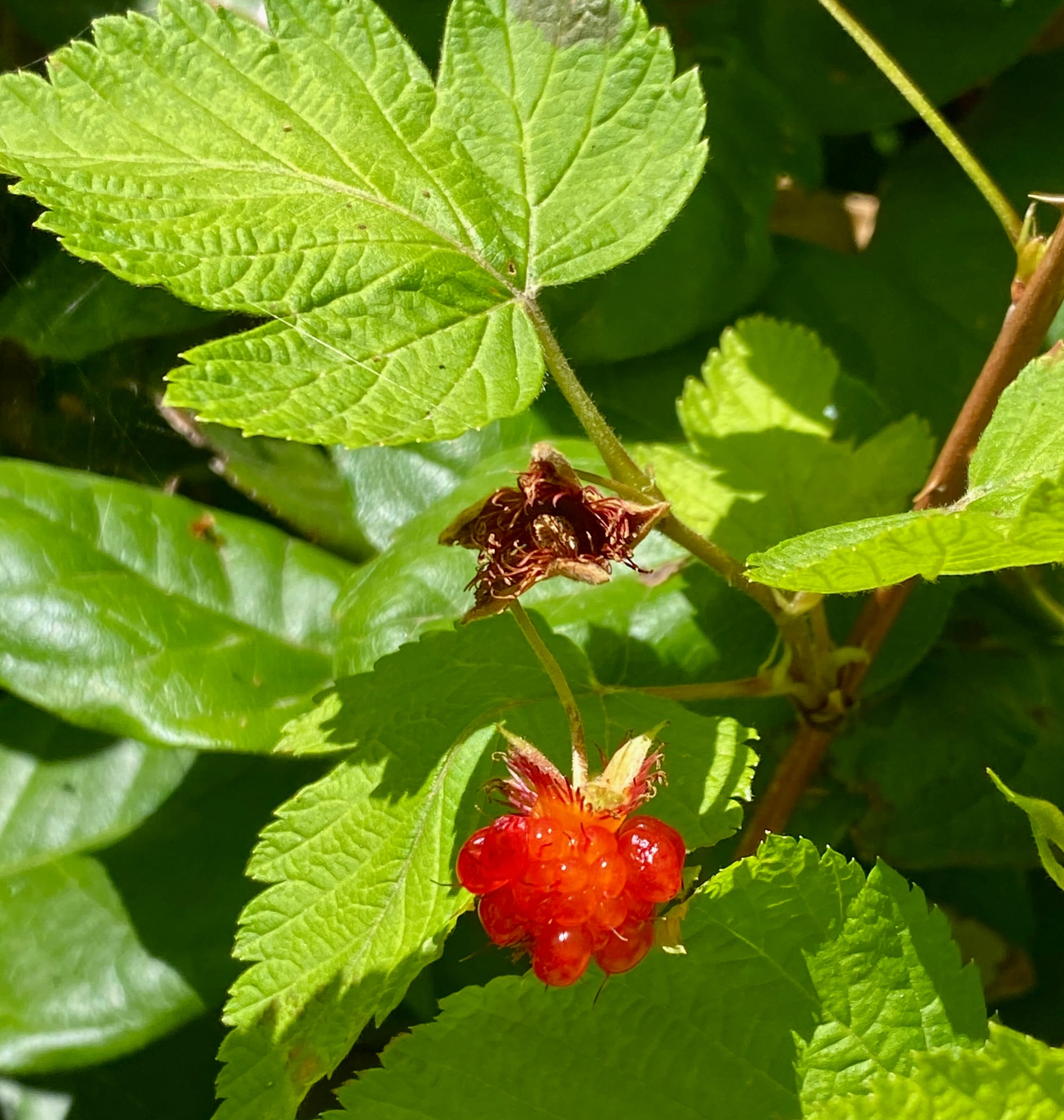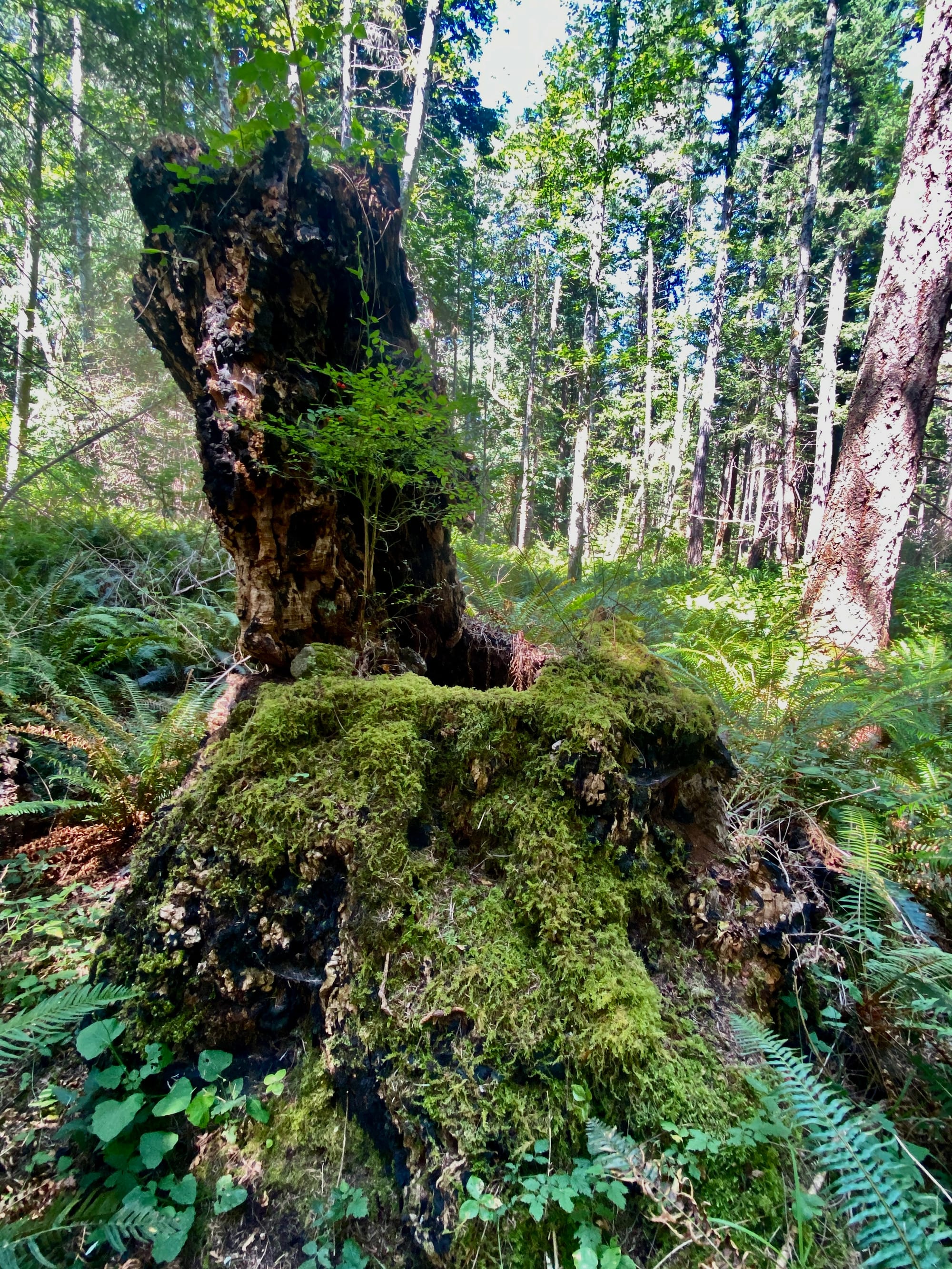 Berries of many kinds are ripening in this forest on the shores of an inland sea; I eat blackberries, both Himalayan and native, red huckleberries of a kind new to me, a couple of salmonberries whose drupelets look like golden-red fish eggs, see again and again the trunks of cedars curving before rising, like the prow of ships sailing through the deep time of these forests, see the roots that reach for darkness, the trunks and branches that reach for light, see this place in the gentle weather of summer, see the great trunks of trees that washed ashore in the storms of winter, see ravens, an owl, robins, eagles, buzzards, seagulls. I see love in the signs of how people have cared for and protected and walked these woods. I see deep time in the old trees and the cycle of life.