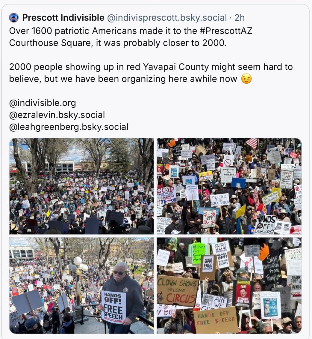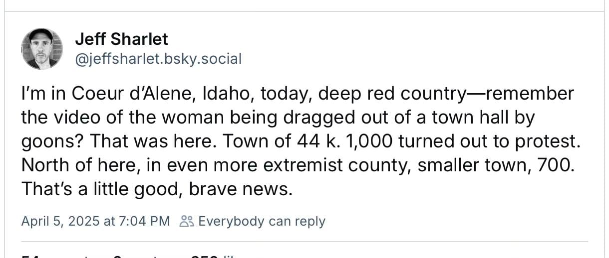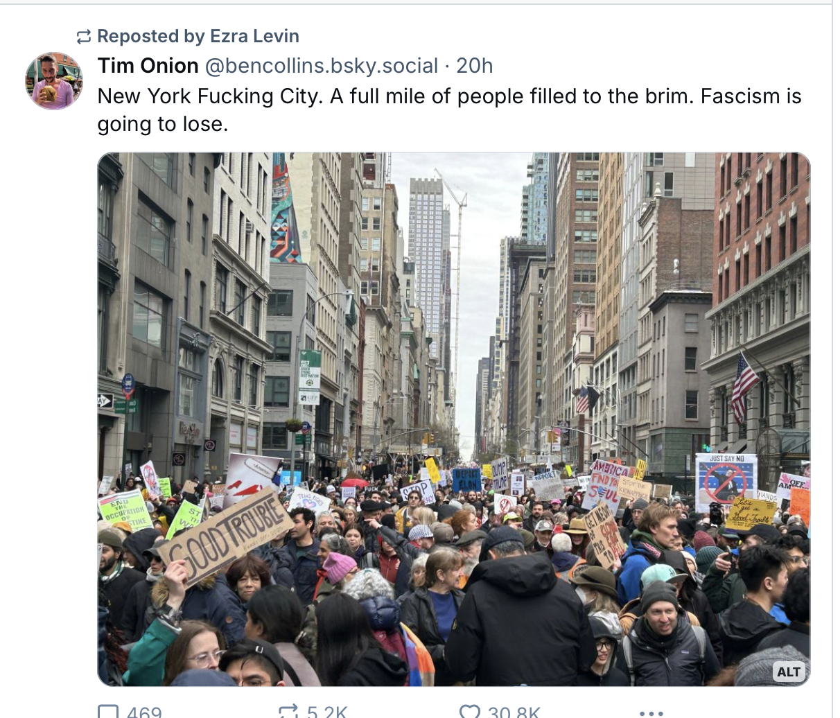 Their data demonstrated that the January 21, 2017, Women's March was the biggest single day of protest in US history, but early evidence suggests to me that yesterday exceeded it, possibly by a lot. The journalist L.A. Kauffman, who's written excellent histories of protest movements and nonviolent activism, commented on BlueSky "A massive decentralized movement like this – everywhere all at once, with everybody pitching in – is extremely difficult for any regime, even the most autocratic, to derail. There are too many leaders, coordinating in too many different ways, for a movement like this to be easily neutralized. And while you usually can't tell the true effect of a protest until long after it's over, today's actions have already made a major impact where we most needed it right now: on people's morale. That in itself is a win."
