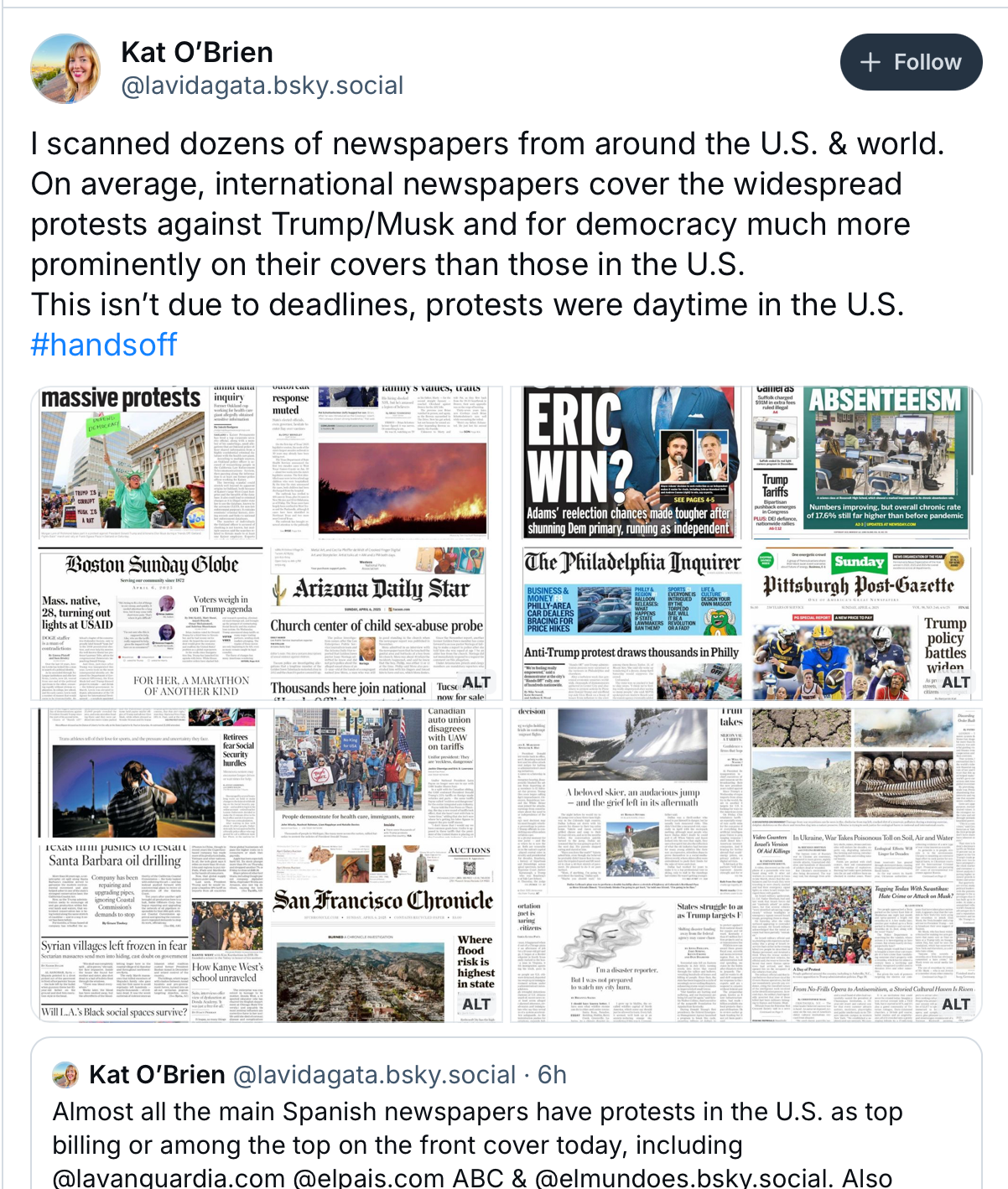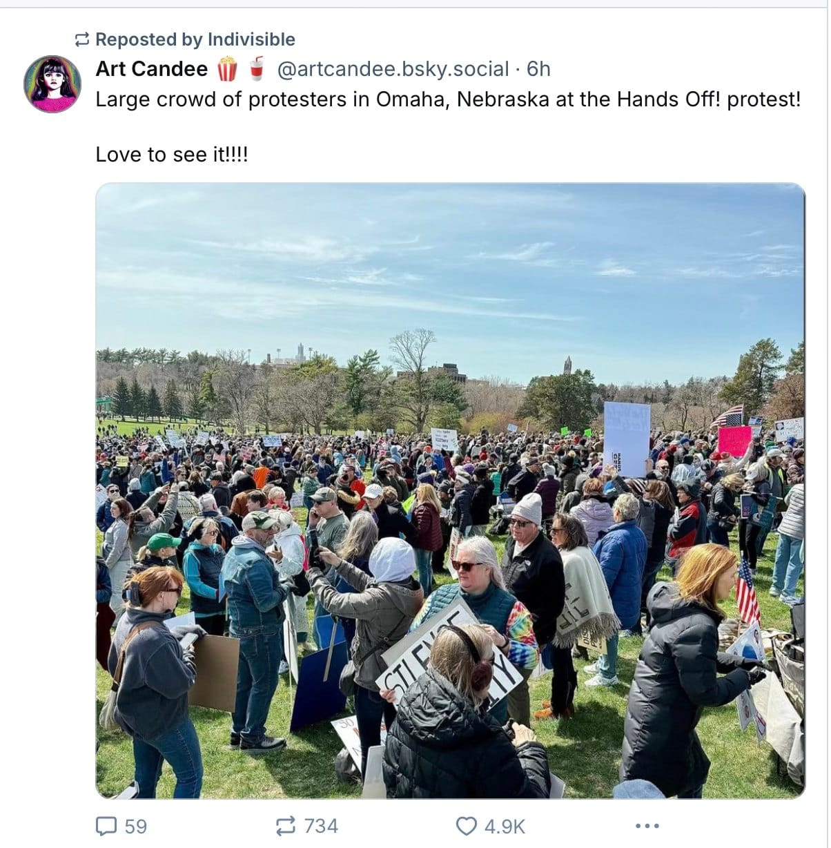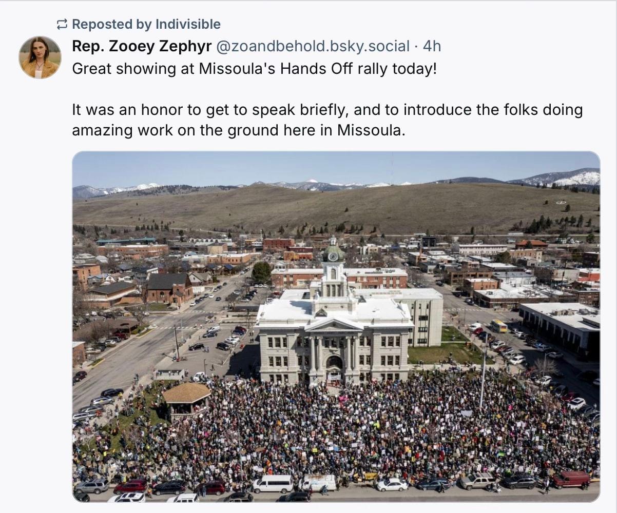 Their data demonstrated that the January 21, 2017, Women's March was the biggest single day of protest in US history, but early evidence suggests to me that yesterday exceeded it, possibly by a lot. The journalist L.A. Kauffman, who's written excellent histories of protest movements and nonviolent activism, commented on BlueSky "A massive decentralized movement like this – everywhere all at once, with everybody pitching in – is extremely difficult for any regime, even the most autocratic, to derail. There are too many leaders, coordinating in too many different ways, for a movement like this to be easily neutralized. And while you usually can't tell the true effect of a protest until long after it's over, today's actions have already made a major impact where we most needed it right now: on people's morale. That in itself is a win."