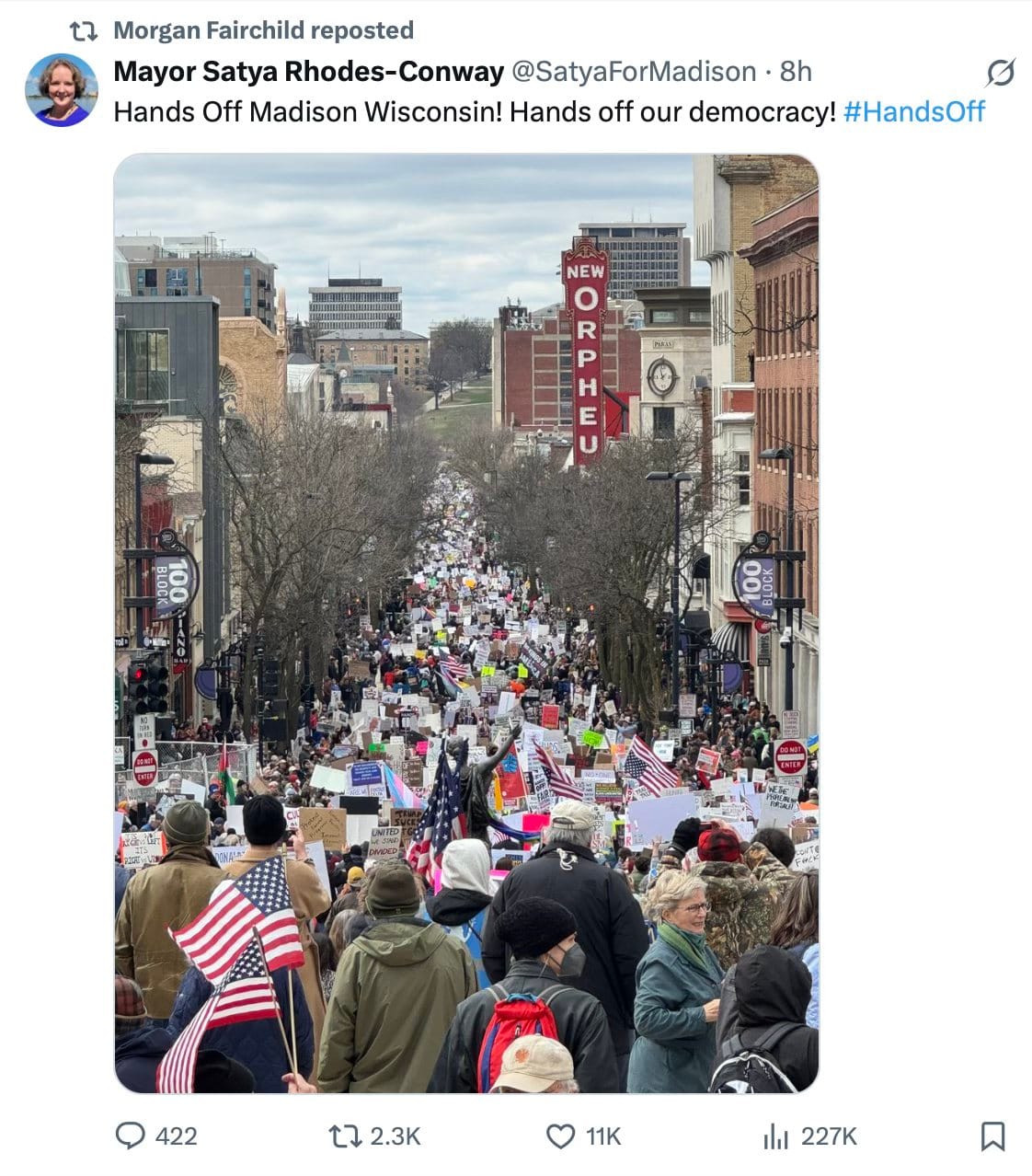 This is already a great day in American history and here we are part of it. But not just American history. They've already stood up and said hands off in London, Paris, Berlin, Lisbon, Amsterdam. The world is against this regime, the world except for the authoritarians who would be thrilled to welcome the US to their ranks. But we won't let them. At least I hope we won't.