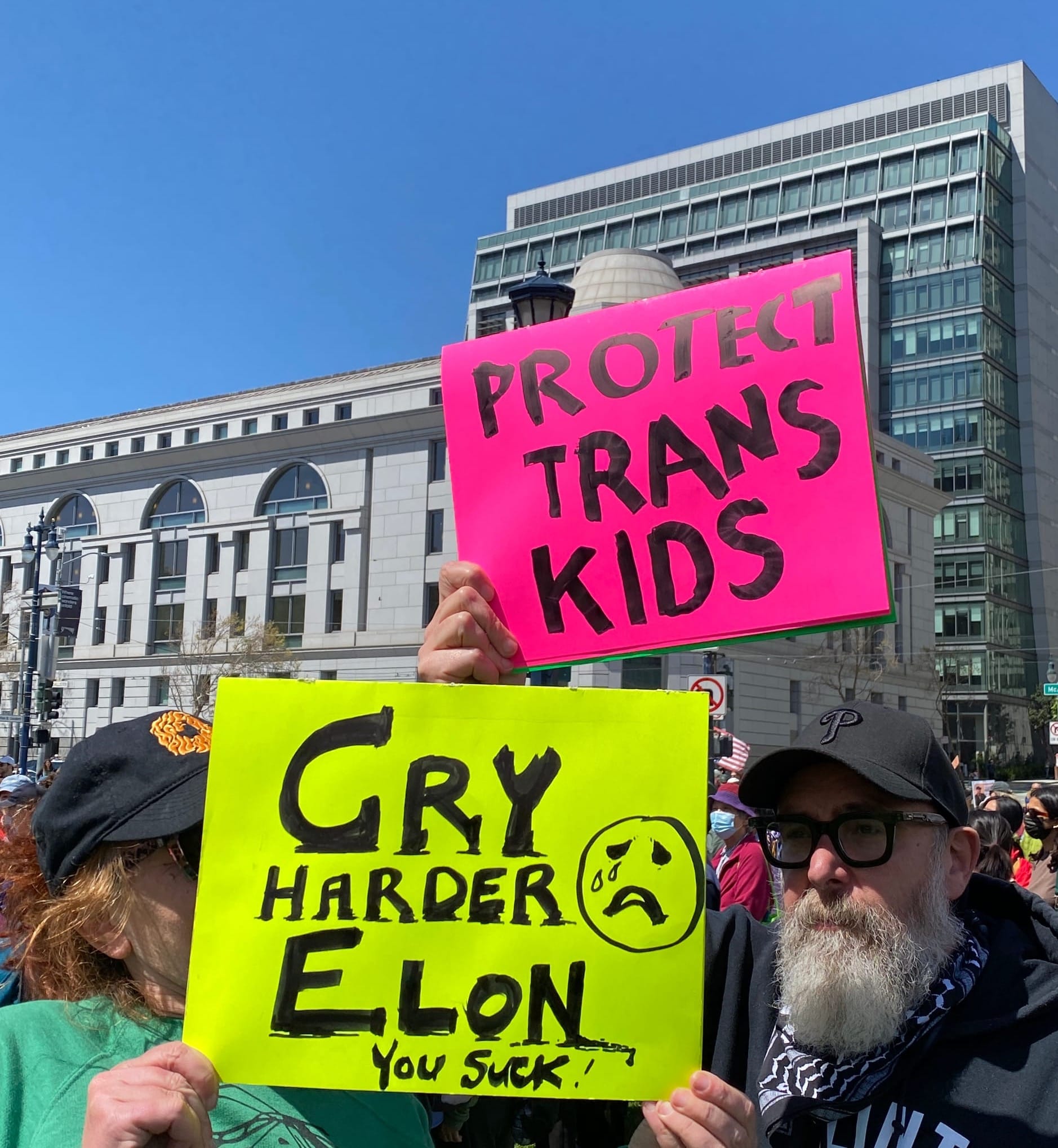 Nobody knows where we go from here. Today is just one day. It's a glorious day, an amazing day. But we need every one of you to go home and figure out what you do next. Be part of something larger. Find your people, find your place, find your skills. Some of us can be loud out in the streets. Some of us will quietly walk children to school whose immigrant parents are afraid to leave the house. Some of us will write letters and call representatives. Some who can afford to will donate, and believe me, money talks. And protest works--thank you Tesla Takedown, whose global day of action against Elon Musk was only a week ago. We are tanking the value of a huge corporation, because people have the power.