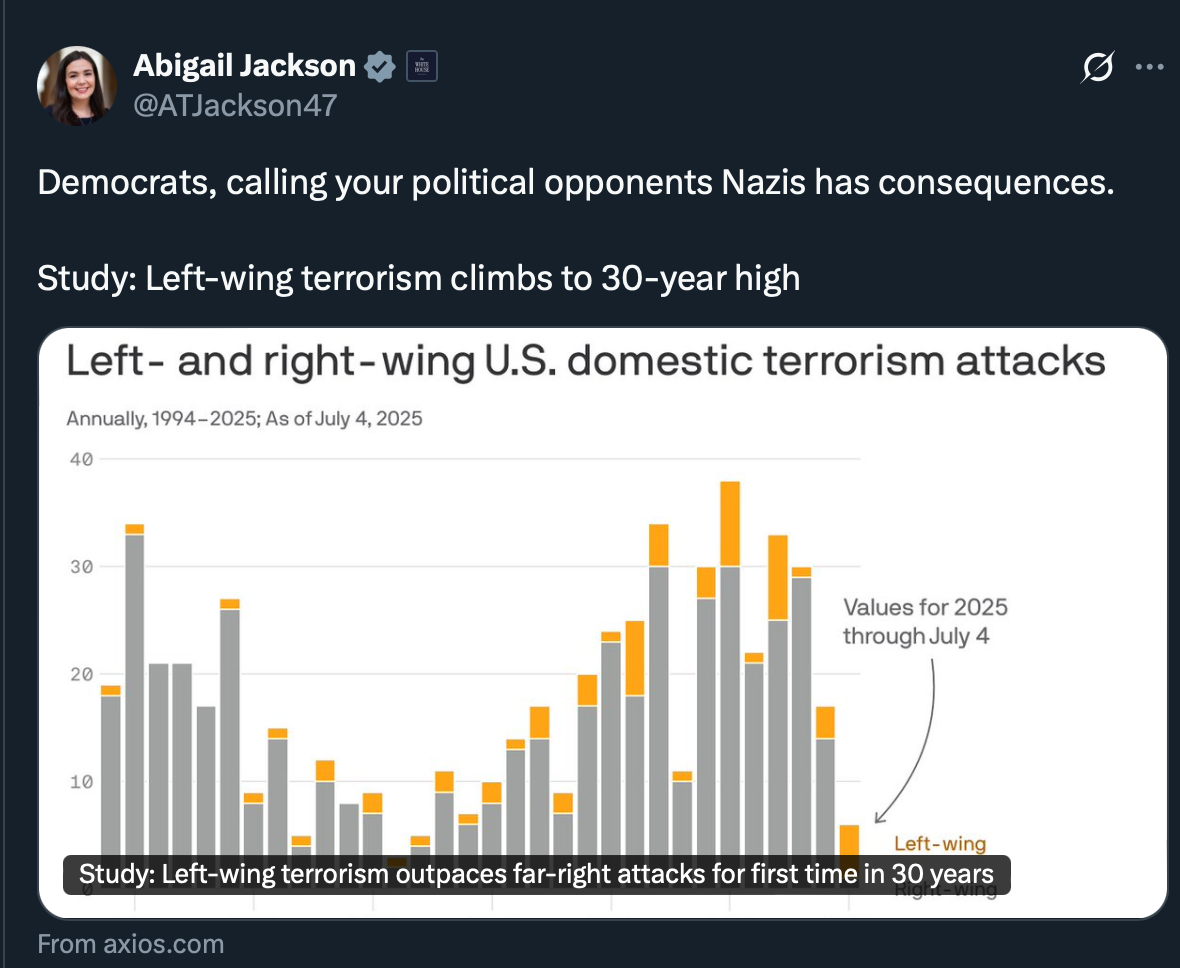 Some pundits and scholars are getting on board with the idea that there's a surge in left-wing violence, which of course raises the question of what the left is, what counts as violence, whether whole political affiliations are responsible for the acts of individuals, and why the massive surge of right-wing violence over the past decade has been so normalized. A recent report by the Center for Strategic and International Studies on "left-wing terrorism" begins, "In recent years, the United States has seen an increase in the number of left-wing terrorism attacks and plots, although such violence has risen from very low levels and remains much lower than historical levels of violence carried out by right-wing and jihadist attackers. So far, 2025 marks the first time in more than 30 years that left-wing terrorist attacks outnumber those from the violent far right." You have to scroll way down the report to find that the increase in left-wing terror attacks amounts to five incidents in 2025, some of them questionably from the left. Five.
