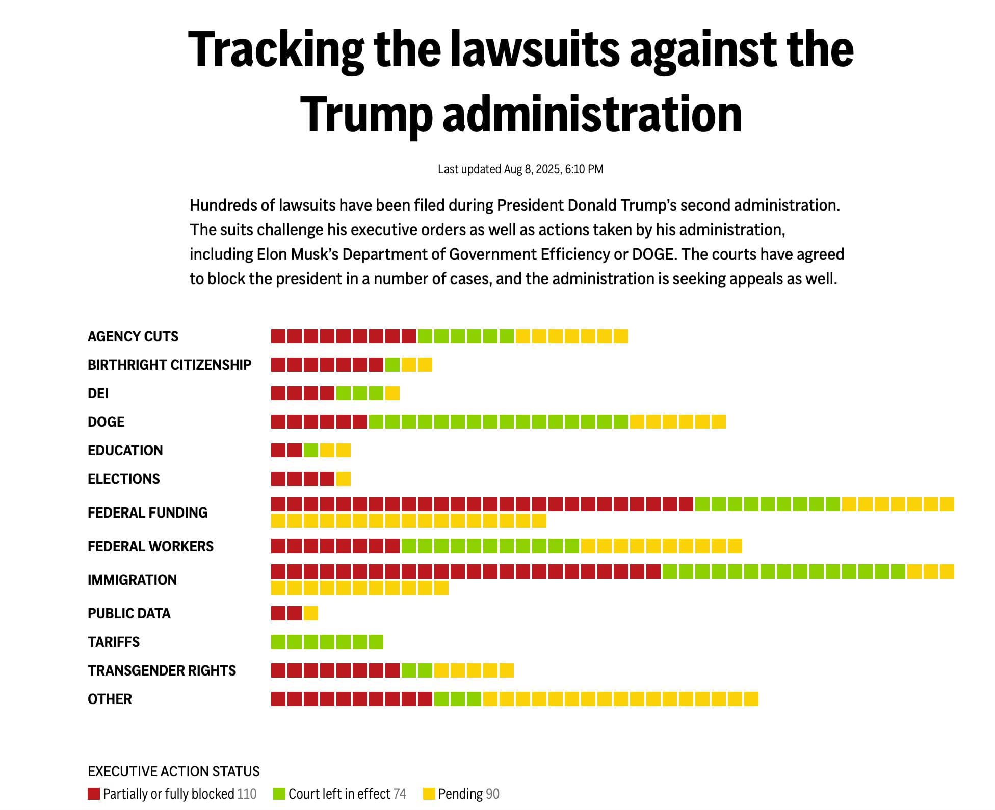 The Associated Press observed on August 8th on this handy chart: "The courts have agreed to block the president in a number of cases" and gave this score: "EXECUTIVE ACTION STATUS: Partially or fully blocked 110; Court left in effect 74; Pending 90." So much winning, a not inconsiderable majority of it by opponents of Team Trump.
