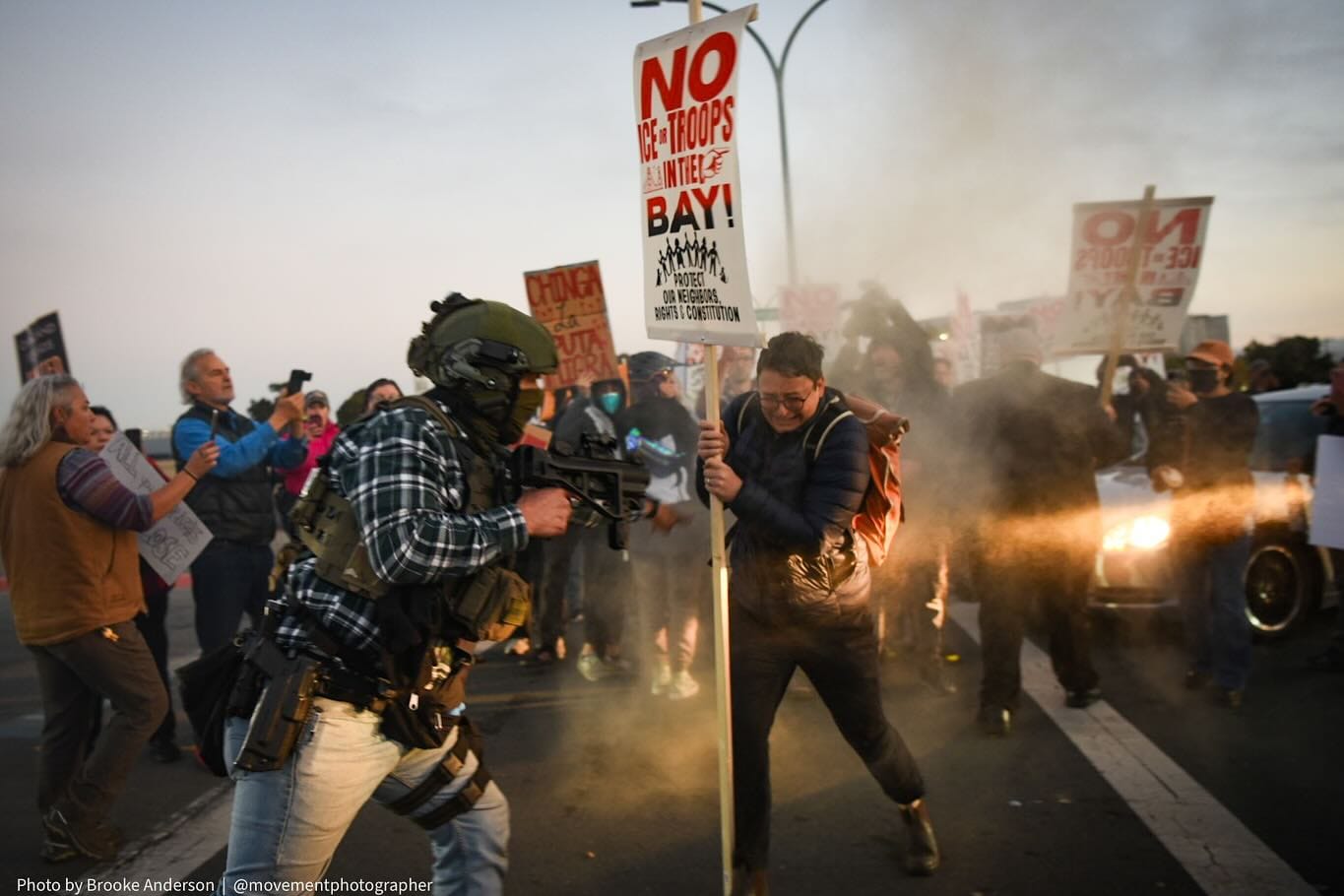 When word went out that border patrol agents had been sent to the Coast Guard island off Alameda near Oakland on the eve of October 23, Bay Area residents sprang into action. Before dawn the next morning, valiant locals began a blockade of the island, which is connected to Alameda by a single road, and they stayed all day. And at 5pm that Thursday, thousands gathered at San Francisco's Embarcadero – thanks to good organizing work, there was a plan and plenty of people knew about it beforehand. At both protests people sported large silkscreened signs that said "No ICE or Troops in the Bay/Protect Our Neighbors, Rights & Constitution." When I got to the Embarcadero myself I saw a few and then a few more and then they started to add up to a lot, not mounted on sticks but handheld.