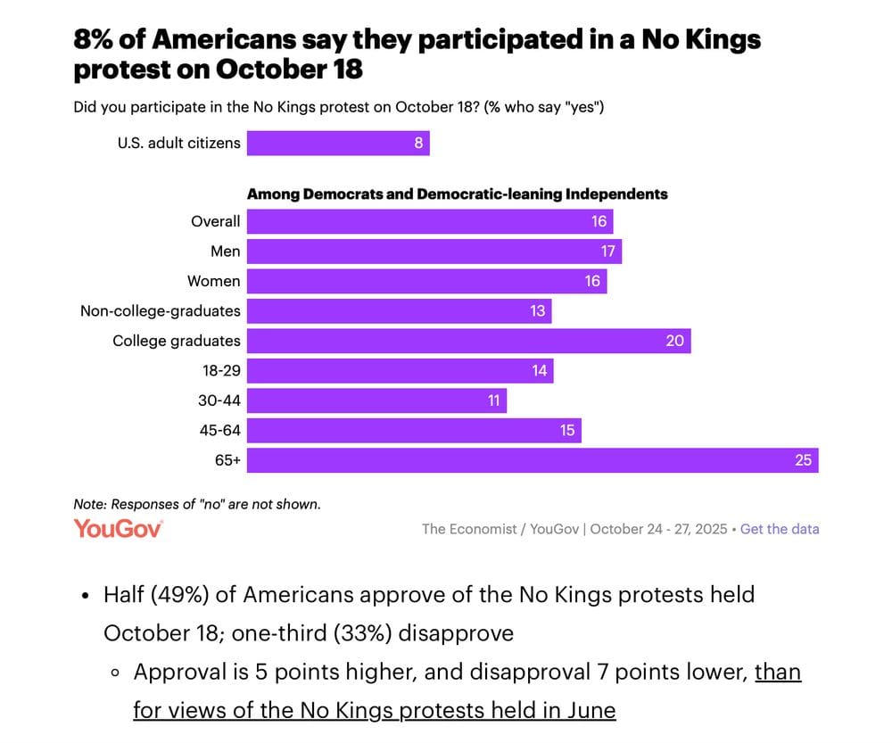 p.p.s. Speaking of the power of protest, the public-opinion research firm YouGov asked residents of the US a bunch of questions you can take a look at in the link below. One was about turnout for #NoKings on October 18, and while I'd really like to know exactly how the question was worded and understood, the answer to how many people participated suggests a stunning turnout. If eight percent of adults in this country did, that's about three times the seven million figure that's been settled upon. Whatever happened at the more than 2700 events across the nation, that so many want to say they participated shows the popularity of the event (and the Crowd Counting Consortium should eventually have some definitive data but their process is careful and far from fast).
