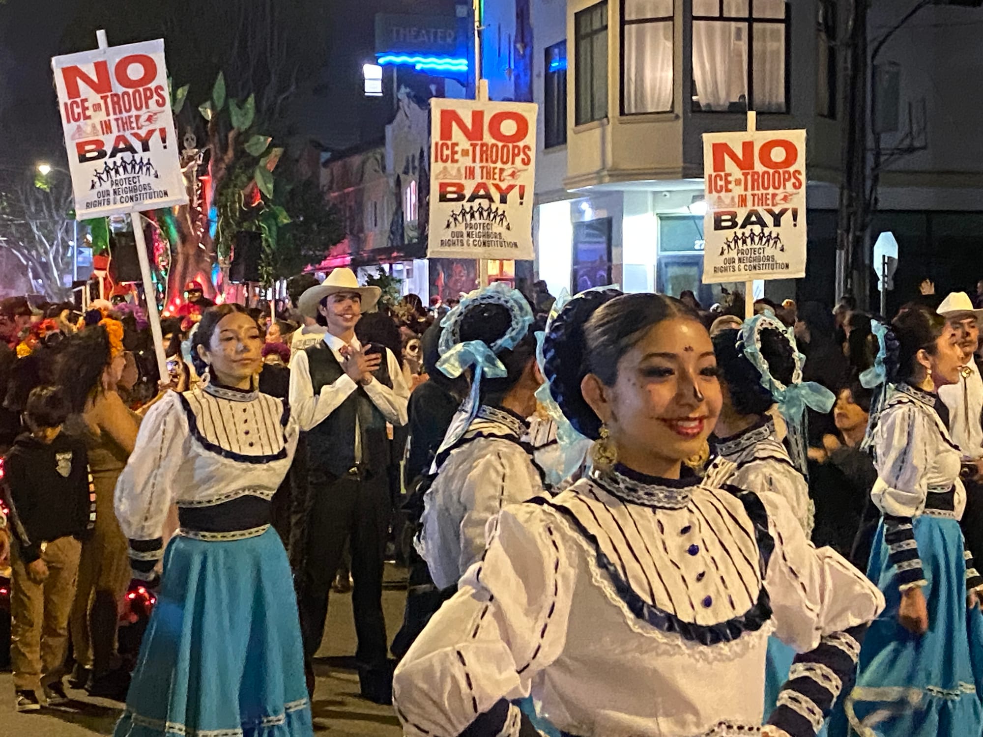 And then that weekend I was talking to a friend of mine who's in the hospitality industry, who told me that one of her beloved workers, who had been with her for twenty years, who was dear to her and good at everything, was in ICE detention. So I reached out to my new lawyer friend sooner than expected, and connected them, and he prepared to help this captive of the Trump Administration. That part of the story is unfinished – but the way a piece of paper with a message caused so many ripple effects in the course of its journey across a city delighted me. I wonder what has become of the hundreds of others, what windows they adorn, what swaps have been made with them, what hearts they've encouraged. I saw three at the November 2 Day of the Dead procession in San Francisco's Mission District (pictured below).