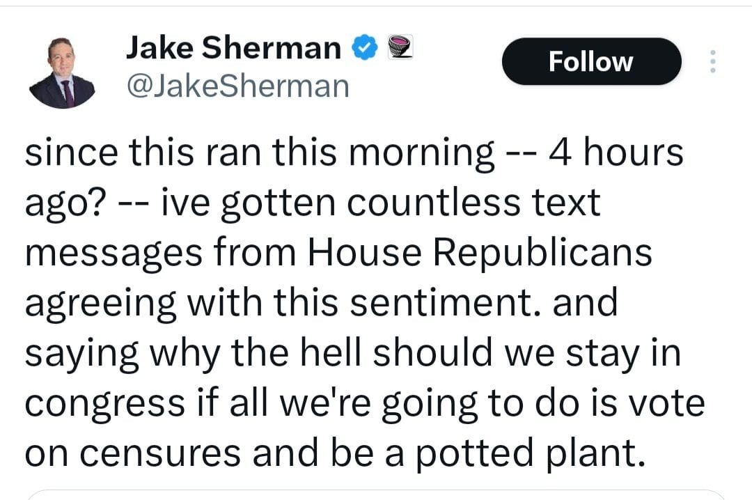 Jake Sherman at Punchbowl News reports, "MTG’s four-page note was stinging for House Republicans. Why? Because the message rang true to so many in the House GOP.In fact, a few other GOP members messaged us over the weekend saying that they, too, are considering retiring in the middle of the term." Jake Sherman adds a long quote from an unnamed Republican congressman who says, "“This entire White House team has treated ALL members like garbage. ALL. And Mike Johnson has let it happen because he wanted it to happen. That is the sentiment of nearly all...." This could bring on the end of the tiny Republican majority in the House before the midterms.