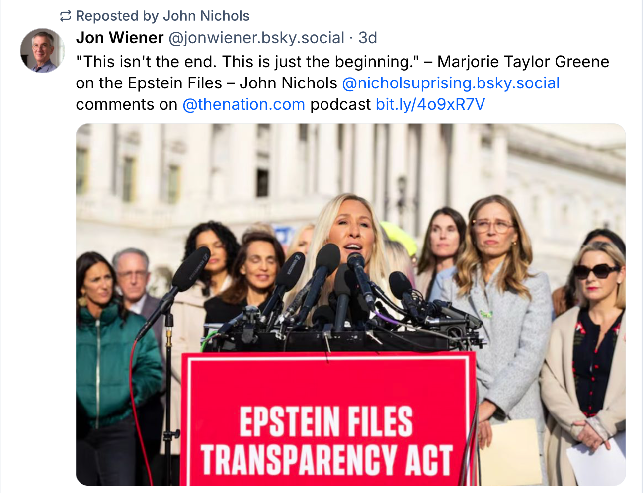 There are many theories about why Trump loyalists Nancy Mace, Lauren Boebert, and Marjorie Taylor Greene joined Congressman Thomas Massie in standing with the victims against the administration (Massie, to his credit, was one of the engineers of the maneuvers to get a vote on the files, working closely with Democrat Ro Khanna to do so; he's one of those interesting Republicans who seems genuinely principled, if not with my principles, while the rest of them seem utterly unprincipled). The short version is no one really knows, but I have the impression that something about the situation reached something authentic in the three congresswomen, and they responded with real empathy and principle. Which I hasten to add I know is not their usual way.