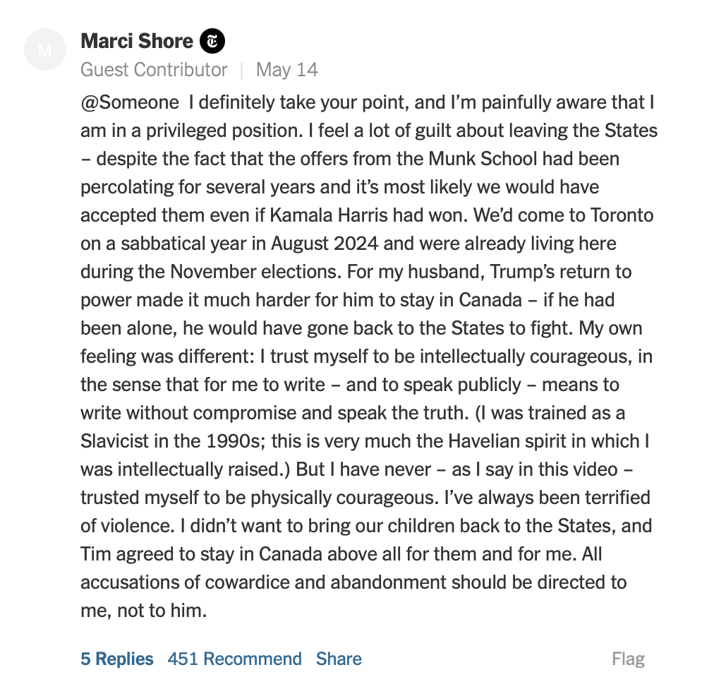 The New York Times's accompanying text includes this sentence about Snyder: "Primarily, he’s leaving to support his wife, Professor Shore, and their children, and to teach at a large public university in Toronto, a place he says can host conversations about freedom." It links to his own essay about his departure published in Yale Daily News, but doesn't include the crucial information that the University of Toronto had been making offers for years, and Snyder and Shore decided to leave well before the 2024 presidential election. Shore read the comments, many of which attack her savagely, and wrote the following reply: