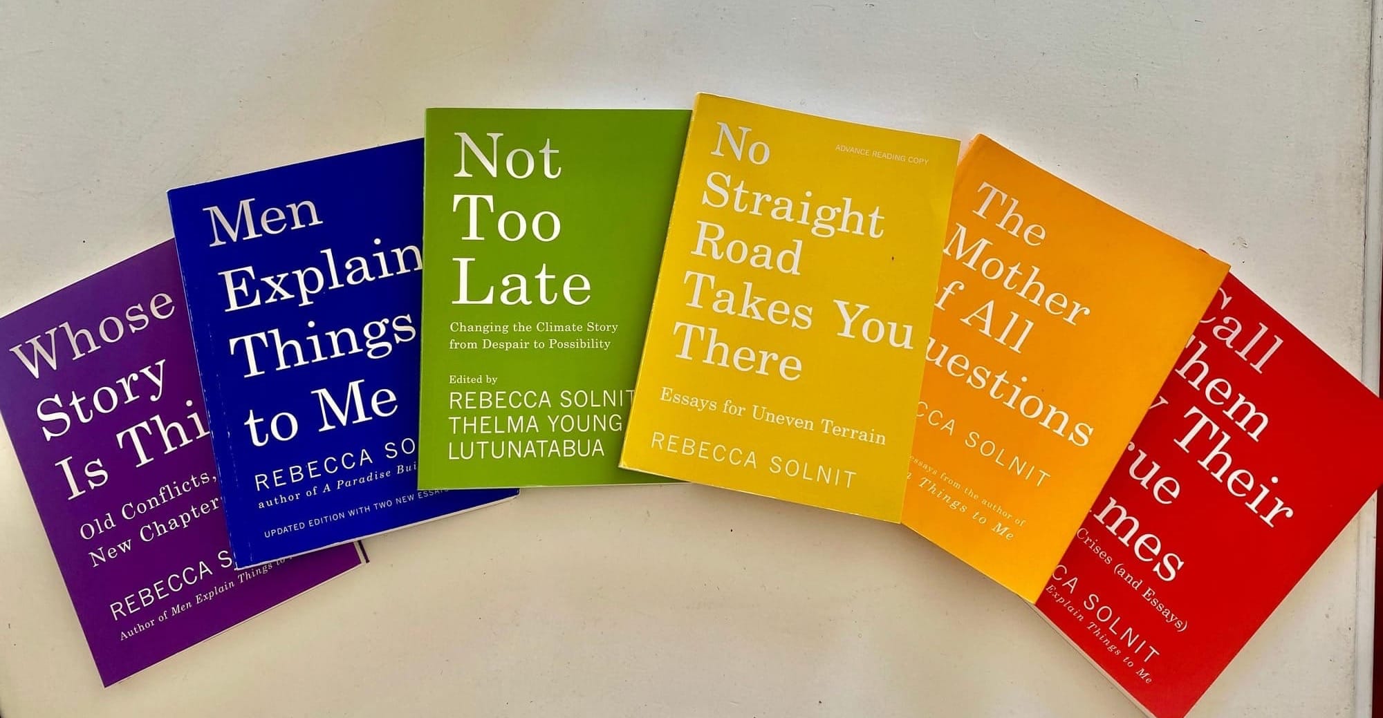 Oh yeah, and the book is this yellow one that completes the rainbow that began in 2014 with Men Explain Things to Me, and my wonderful publishers at Haymarket got on board with this color scheme, which I hope bookstores will deploy on their shelves. That it's the same color scheme as the rainbow Pride flag Gilbert Baker designed at Harvey Milk's behest in 1978--or to get technical, the later state of that flag--delights me and was very intentional.