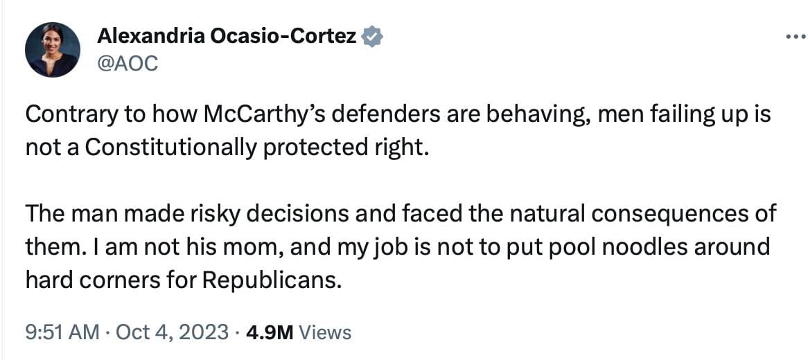 p.p.s. Here's a gorgeous tweet from Congresswoman Ocasio-Cortez when the Democrats in the lower house were being blamed for not rescuing Republicans from their own chaos as they sabotaged Kevin McCarthy's position as speaker and failed for weeks to elect a replacement. The Washington Post editorial board had declared of the mess Republicans had made, "Democrats should be willing to help them clean it up" by voting for a Republican speaker instead of their own candidate or by voting president.