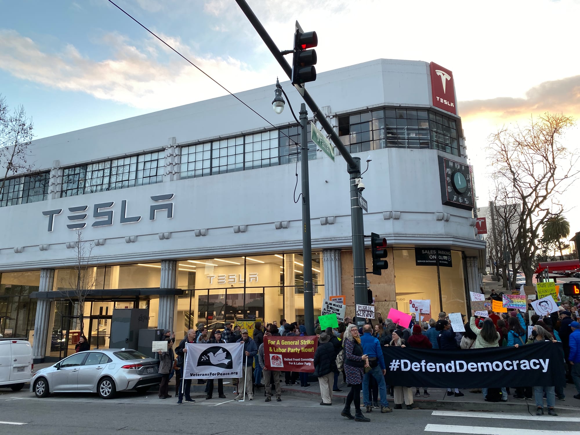 People were amazing at that protest called for and by federal workers in front of Tesla in central San Francisco. It felt like maybe one out of every four cars driving down wide Van Ness Avenue honked, and nearly every MUNI bus driver sent off a flurry of deep honks, and people driving by shouted and pumped their fists. The crowd was lovely and sweet and maybe not as loud and energized as some I've been around, but they were there, there to support federal workers and oppose the coup and its leaders, and that's what counted in the moment. And some of them were federal workers. No cops in sight, no pedestrians grumpy about the crowded sidewalks.