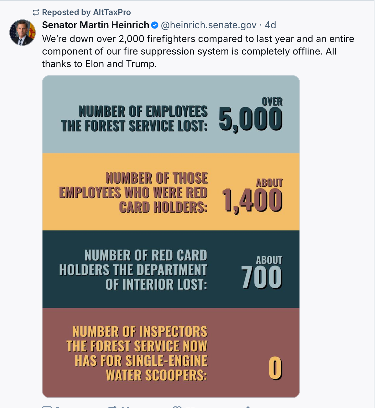 --The Forest Service employee roster has been thinned out in ways that affect the ability to fight wildfires, which along with abolishing the roadless rule, puts millions of acres of federal forestland in peril. Senator Martin Heinrich of New Mexico puts the cuts at 2000 firefighters. Congressman Jeff Hurd of Colorado puts the numbers even higher: "Red-card-carrying Forest Service staff have the skills, training, and qualifications to supportwildfire response (and, indeed, fight wildfires), but hold other full-time jobs at the agency. Redcard holders are the backbone of federal firefighting efforts, proving critical support and addedcapacity when a wildfire breaks out. We estimate, since January, the Forest Service has lostroughly 3,000 red-card holders across the country."