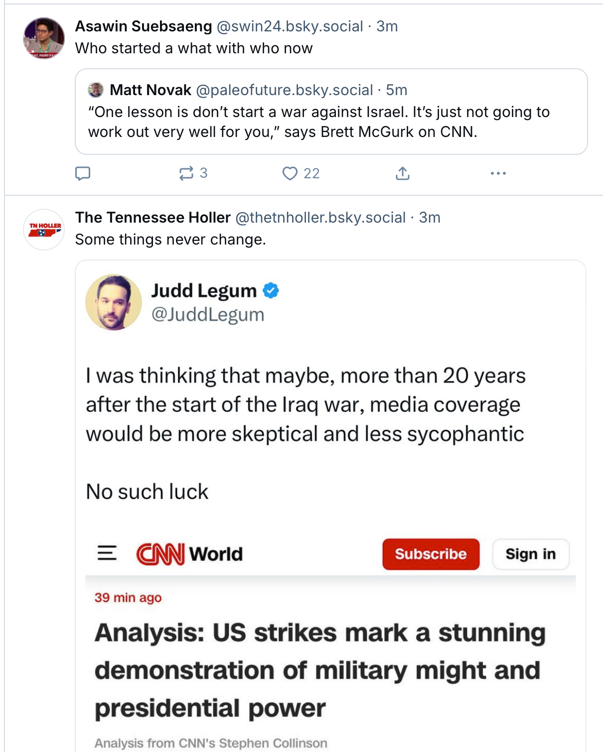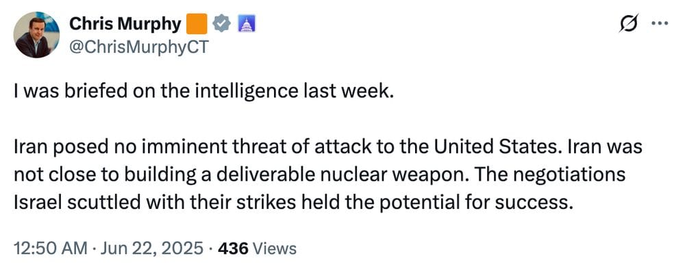 And there's no good explanation or rather justification for why our military just dropped a bunch of big bombs on a country on the other side of the world. Former congressional staffer and Washington insider Matt Vallone declared, "We have no strategy other than to hope that Iran knuckles under following our escalation. That may work but it seems unlikely, so instead we're going to have an unconventional war with Iran." He also remarked last night, "I am a relatively informed person who works in the national security space. I've followed Washington decision-making closely for 15+ years now. I am fairly well-read and pay attention to a range of news sources. I do not know what our goals our vis a vis Iran, nor how we expect to achieve them." No one knows if or how Iran will retaliate, but I suppose we'll find out.