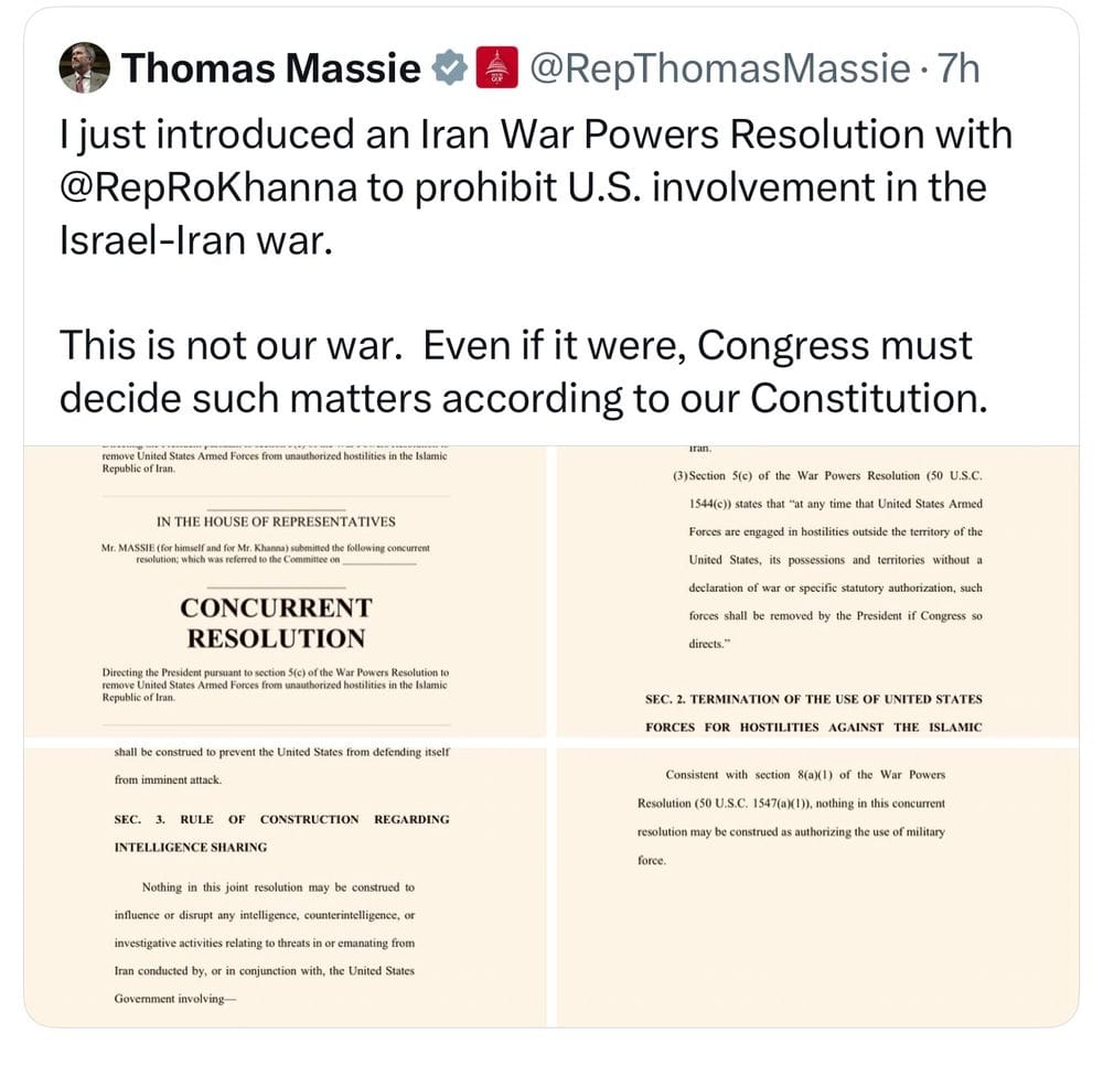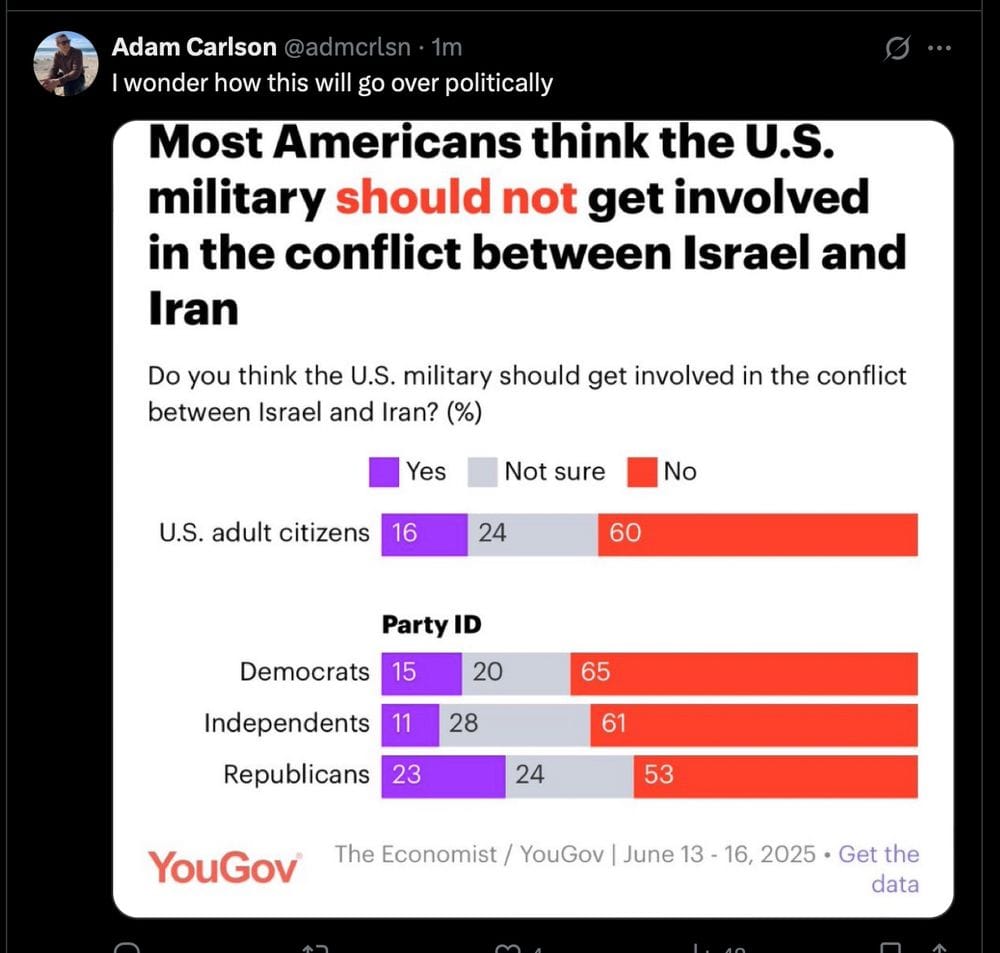 Meanwhile the US military bombed Iran, and it seems like an incredibly stupid and bad thing to do, and most of the politicians I've seen speak up are speaking up against it – many Democrats (except for Pennsylvania's Senator John Fetterman, who's become a turkey who thinks he's a hawk) and Republican Thomas Massie, who had introduced a resolution to prohibit the US from joining Netanyahu's war and tweeted "this is not Constitutional" when news of the bombing broke.
